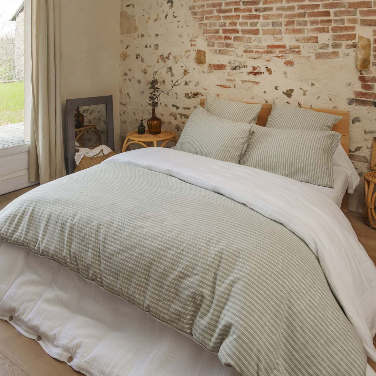 Sur un lit composé avec la housse de couette TEO, la taie d'oreiller joue le rôle de continuité entre la tête de lit et la surface de la couette. Le recto coton texturé vert et écru prolonge le motif de la housse sur les oreillers — la lecture verticale des rayures de la taie entre en dialogue avec la lecture horizontale de la housse et crée une tension graphique douce, sans rupture. Le verso percale blanche, lui, fait écho au dos de la housse de couette : retournée, la taie devient entièrement blanche et s'harmonise avec un lit épuré. La combinaison des deux formats — une ou deux taies 50 × 70 cm et une ou deux taies 60 × 60 cm selon la configuration du lit — permet de composer une tête de lit structurée à plusieurs niveaux, avec des oreillers de tailles différentes.