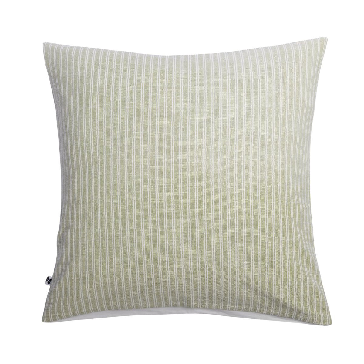 Le coton texturé de la face avant de la taie TEO présente les mêmes caractéristiques que la housse de couette de la collection : un grain serré, légèrement mat, qui capte la lumière selon l'angle. Les rayures verticales vert et écru — tissées dans la masse, pas imprimées — donnent au recto une direction de lecture différente des rayures horizontales de la housse de couette, créant une complémentarité graphique subtile sur la tête de lit. Le verso percale lavée blanc est lisse, légèrement satiné, contrastant avec la densité du recto — deux états de surface qui coexistent dans une seule taie, comme dans l'ensemble de la collection.