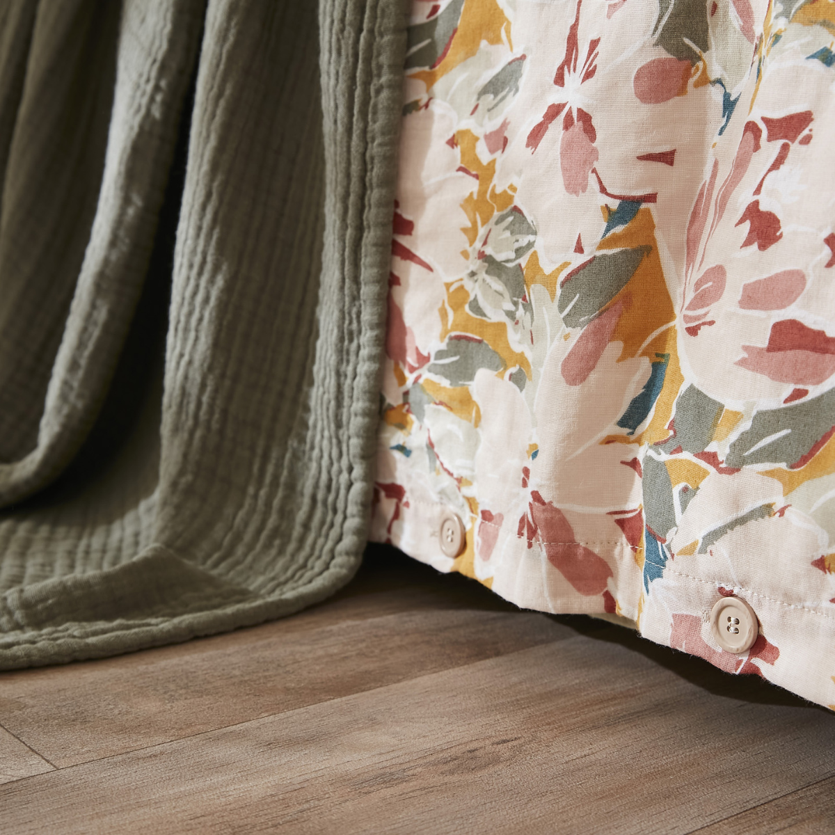Recto, un imprimé floral abstrait vibrant aux formes libres et à la palette chaude. Verso, un uni vert d'eau apaisé en double gaze de coton unie.