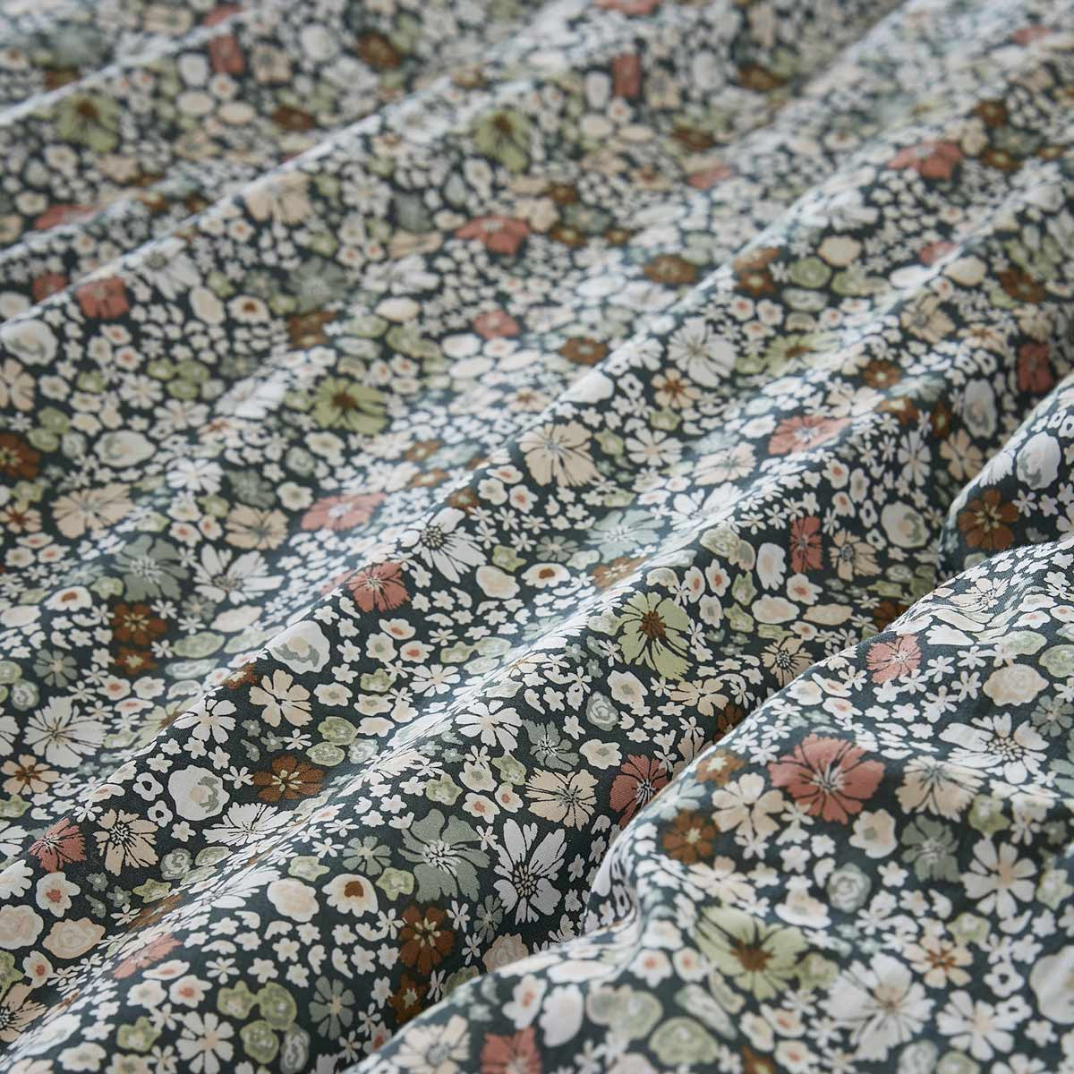 La Couette MALIA développe son motif millefleurs sur fond vert ardoise foncé, entre l'anthracite et le vert bouteille sombre.