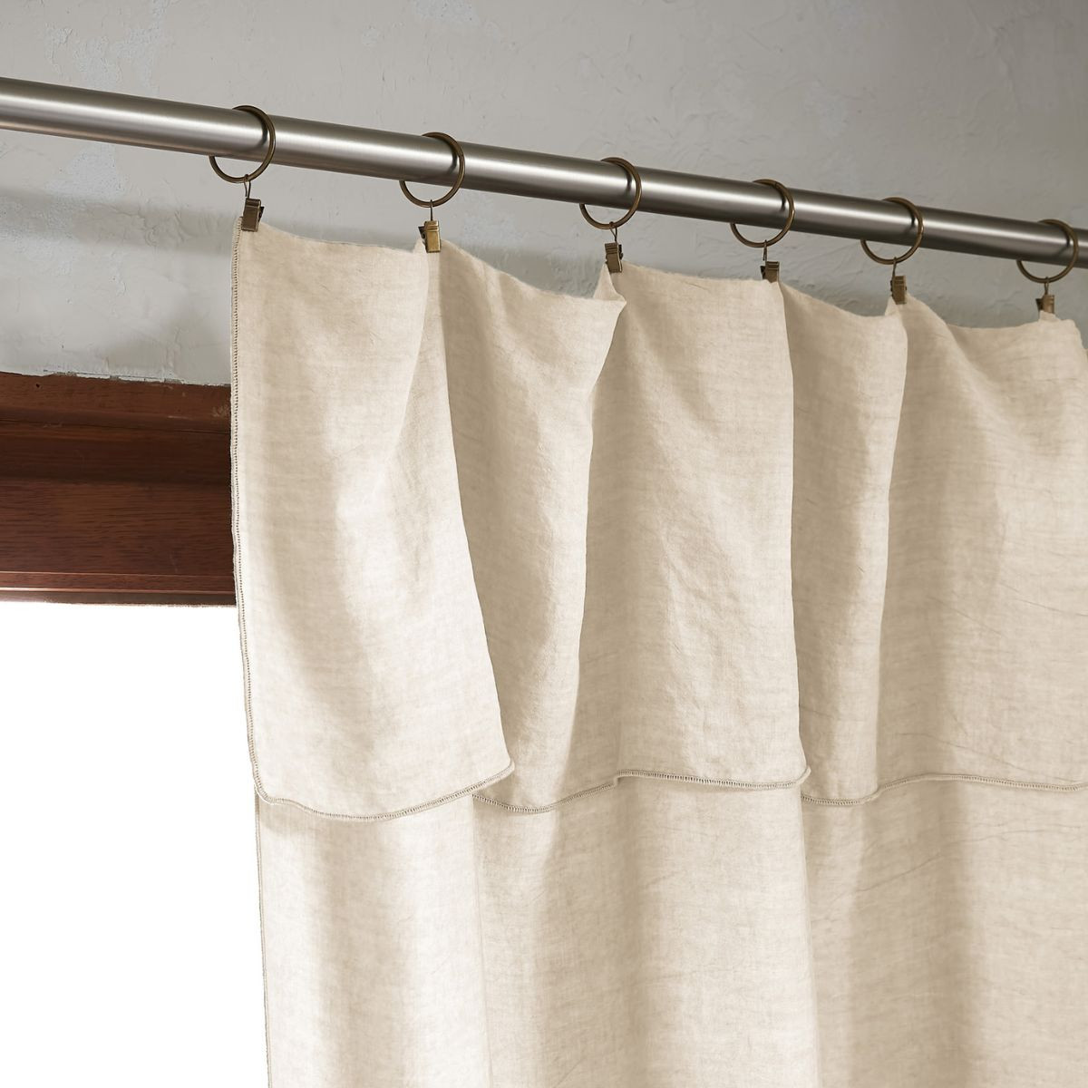 La tête du rideau LYSANDRE est construite avec une double épaisseur de tissu sur environ 20 cm, cousue et finie d'un point bourdon ton sur ton — une solution de finition qui structure le haut du panneau sans raideur, maintient les plis en place sous les anneaux-pinces et donne de la consistance visuelle à la suspension. Le point bourdon est travaillé dans le même ton que le tissu : discret, il souligne le bord sans contraster.