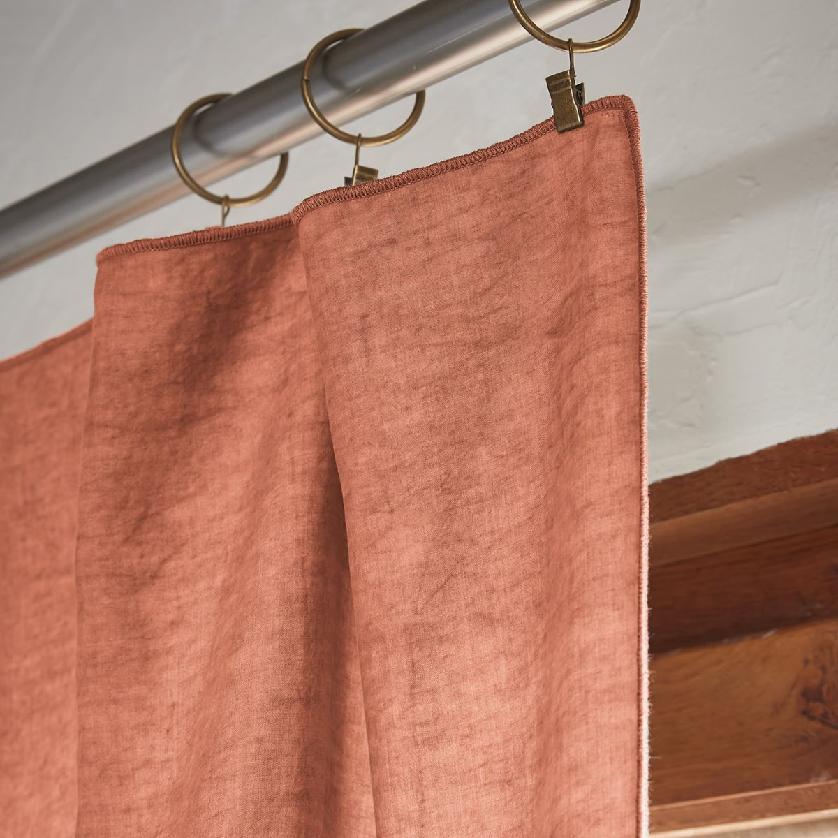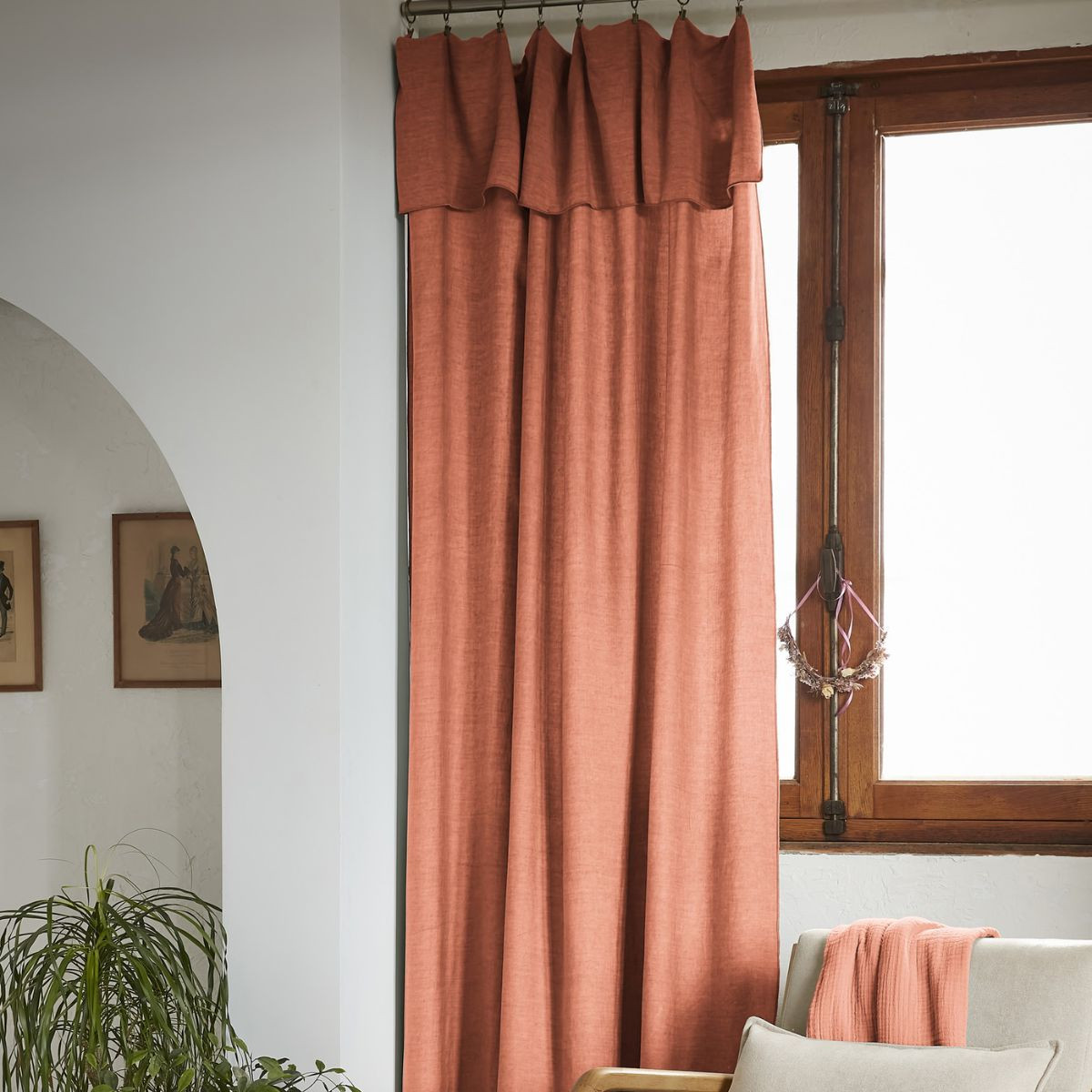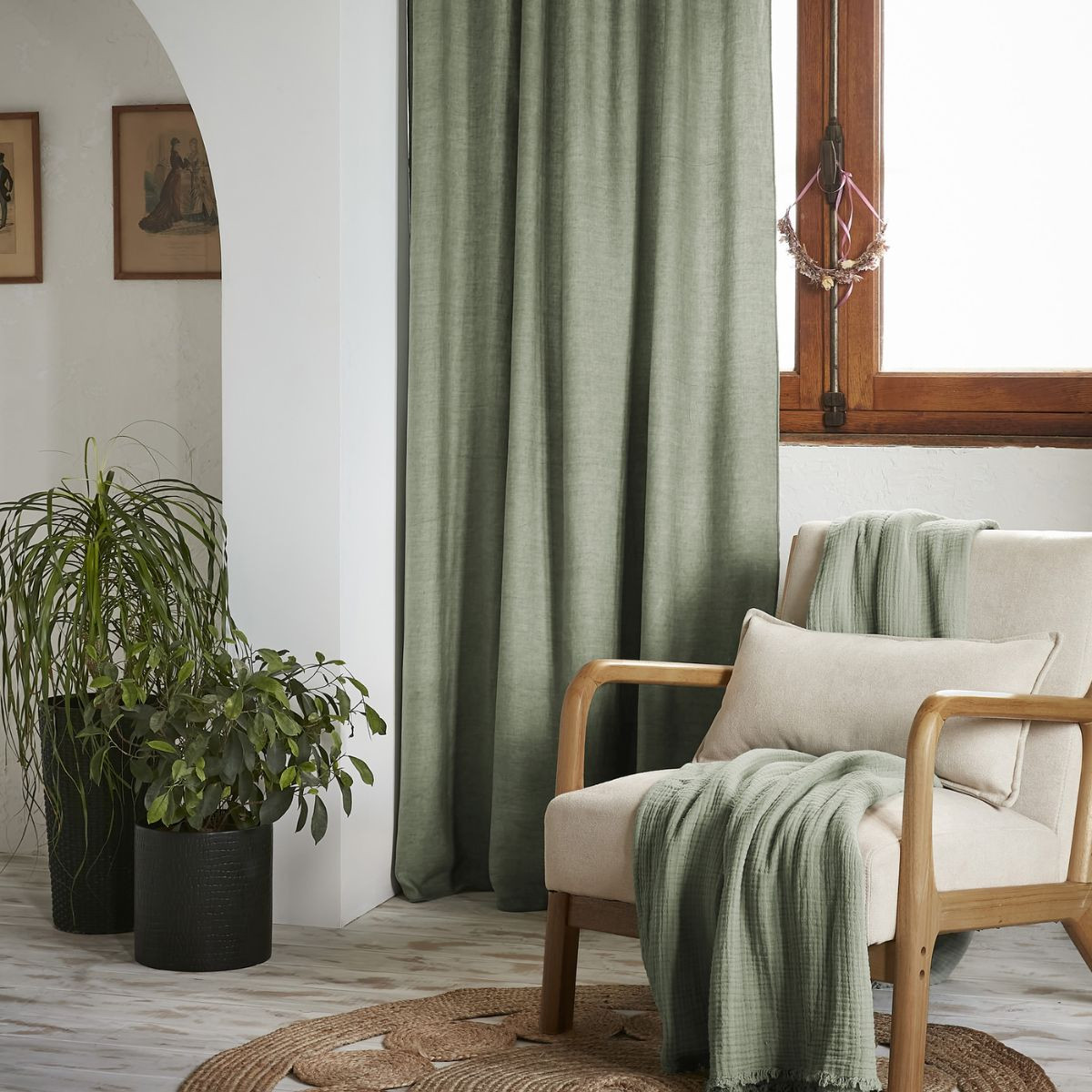 Il s'intègre naturellement dans un intérieur qui mélange bois brut, enduit naturel et matières organiques — lin, coton, jute, rotin — sans avoir besoin d'être coordonné à une palette précise. Lavable en machine à 30 °C, sèche-linge modéré possible, repassage à basse température si nécessaire — un entretien simple pour un rideau que l'on garde longtemps.