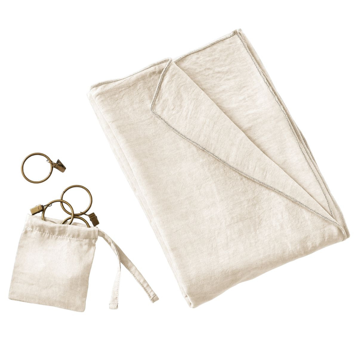 Le rideau LYSANDRE est finitionné d'un point bourdon ton sur ton sur les quatre bords, avec une double épaisseur structurée en tête de rideau — un détail de fabrication qui donne de la tenue en haut du panneau tout en conservant la fluidité du tombé sur toute la hauteur. Format unique : 140×270 cm.