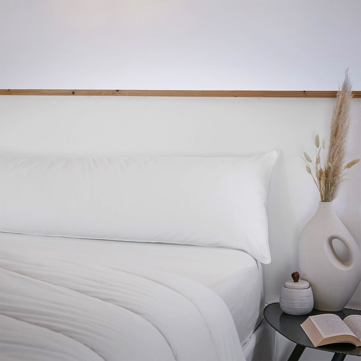 Ambiance — Neutre, soigné, universel. Le blanc du SIRIUS disparaît sous n'importe quelle taie de traversin — en lin naturel, en coton lavé, en percale — sans jamais transparaître ni tacher la taie par migration.