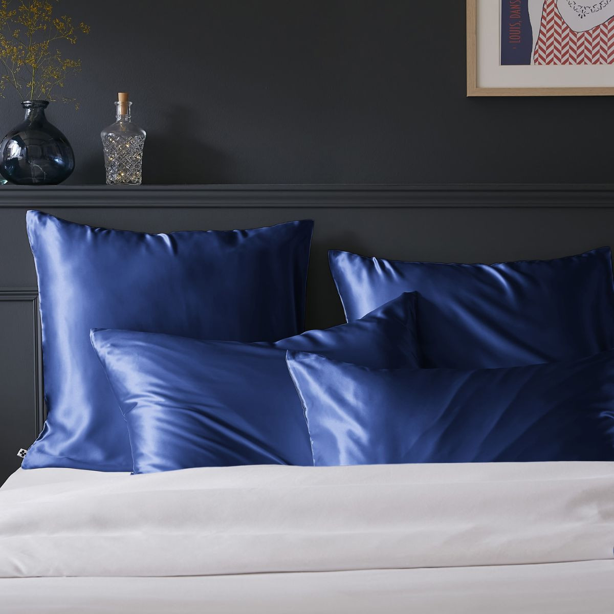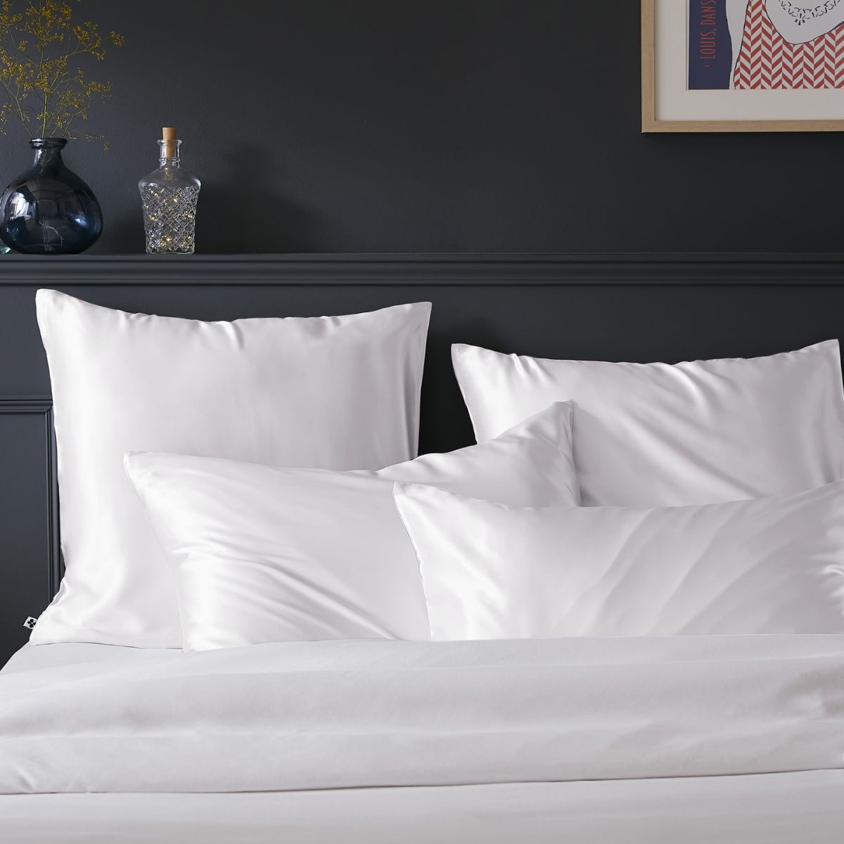 Taie d'oreiller SALOMÉ de L'Effet Papillon. Satin de bambou 100 % viscose, 120 fils/cm². 63×63 et 50×70 cm. Prend soin de votre peau et de vos cheveux chaque nuit.