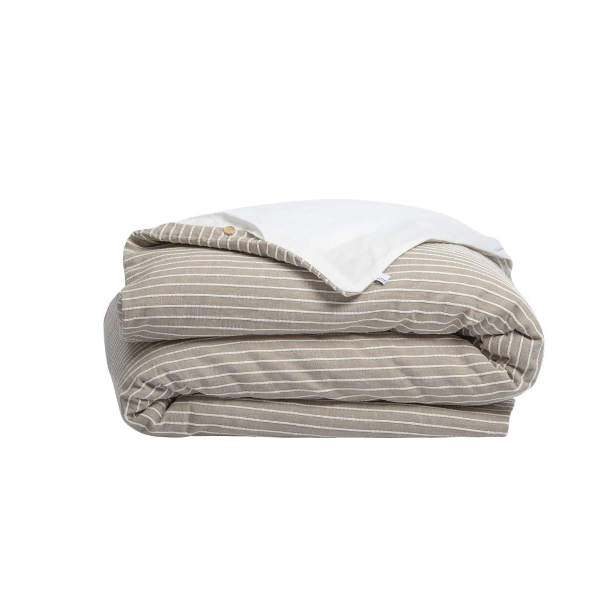 Confectionnée en 100 % coton, cette housse marie avec subtilité un coton texturé 345 g/m² en face avant — aux rayures tissées en relief qui développent leur caractère au fil des lavages — et une percale lavée 80 fils/cm² en face arrière, cette finition mate et souple typique des grands linges français. L'ouverture à boutonnières avec boutons en bois naturel facilite l'insertion de la couette tout en apportant une signature artisanale discrète. La collection TIM se décline en deux formats : 240×220 cm pour les lits standard et 240×260 cm pour les matelas épais ou les amateurs de retombées généreuses.