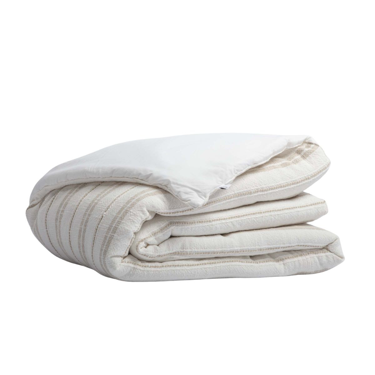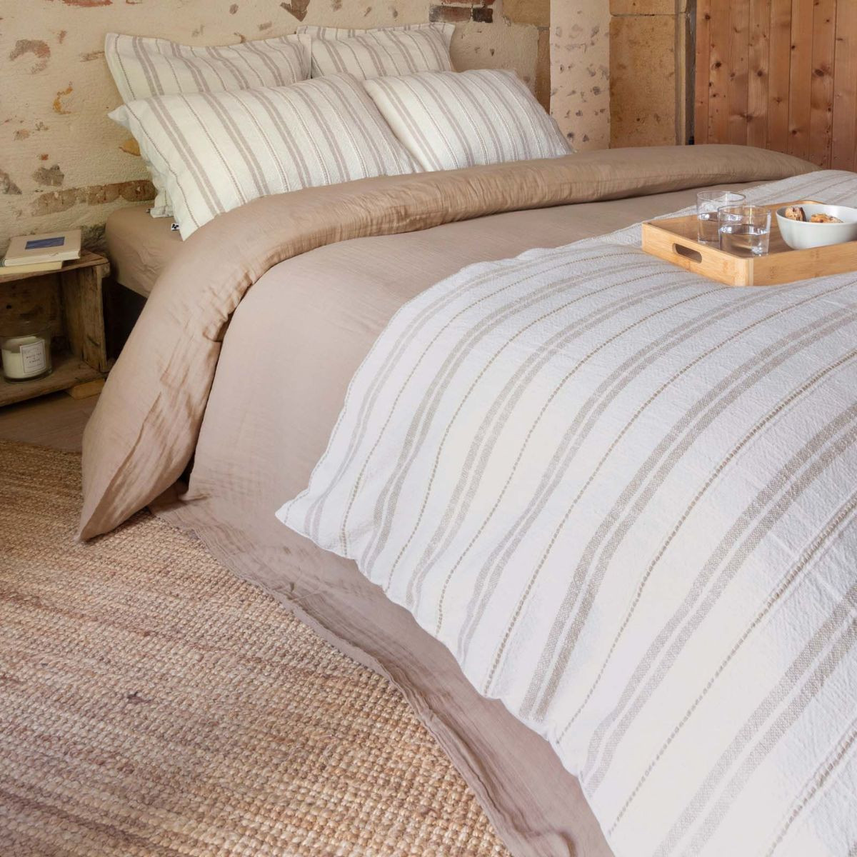 Laissez-vous séduire par un édredon qui transcende sa fonction d'accessoire pour devenir une signature décorative contemporaine. La collection TOM révèle toute sa modernité dans cette déclinaison biface où l'expertise textile rencontre l'esthétique graphique. Cette construction sophistiquée offre deux univers dans un seul geste : une face au coton texturé dense aux rayures verticales espacées qui structurent et dynamisent l'espace de la chambre, une face en percale lavée douce et fluide qui apporte sérénité et épurement visuel. Cette dualité transforme instantanément le caractère de votre literie selon la face choisie, créant une modularité déco rare qui suit vos envies esthétiques et les saisons.