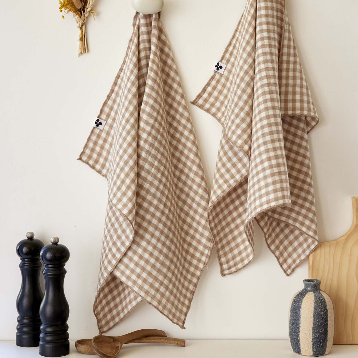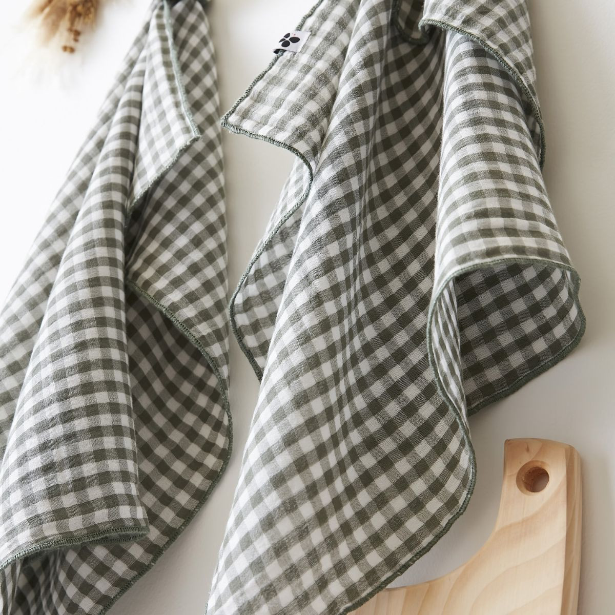 Lot de 2 essuie-mains ROMIE de L'Effet Papillon. Double gaze de coton 100 %, point bourdon ton sur ton, passant d'accroche. 50×70 cm. Le geste quotidien avec du caractère.