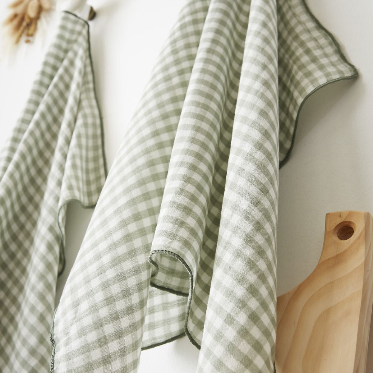 Confectionnés dans la même double gaze de coton 100 % noble que les rideaux et nappes de la collection, ces torchons révèlent un grammage de 125 g/m² parfaitement adapté à l'usage cuisine : suffisamment absorbants pour sécher efficacement vaisselle et surfaces, assez résistants pour supporter les lavages fréquents sans déformation. Le motif vichy structuré apporte cette géométrie rassurante qui unifie visuellement l'espace culinaire et s'harmonise naturellement avec tous les styles de cuisine, du plus rustique au plus contemporain. Les finitions point bourdon ton sur ton témoignent du soin artisanal apporté aux détails, créant cette bordure élégante et résistante qui préserve l'esthétique même après usage intensif. Proposés en lot de 2 dans le format généreux 50×70 cm, ces torchons offrent cette surface d'absorption optimale tout en se rangeant facilement dans les tiroirs ou suspendus aux crochets décoratifs.