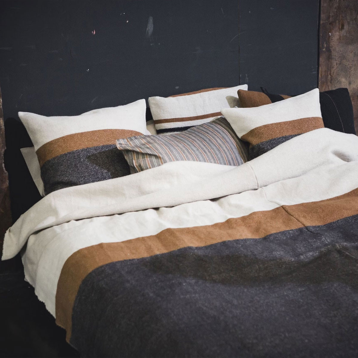 Couvre-lit Nash de Libeco. Mélange Lin (70%) et Laine (30%) (610 g/m²). Coloris arabica, bone et beeswax. Chaleur et élégance. Fini avec une couture centrale. Dimension 260x240 cm.