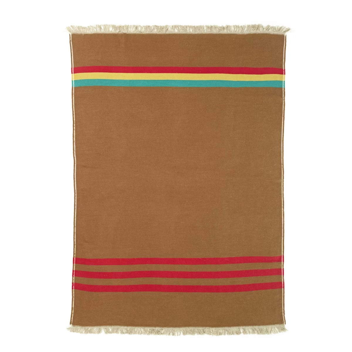 - Motif : Fond neutre avec rayures rouges, vertes et moutarde. Franges couleur lin