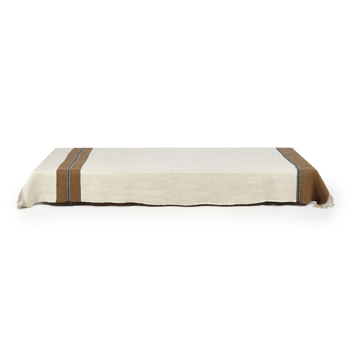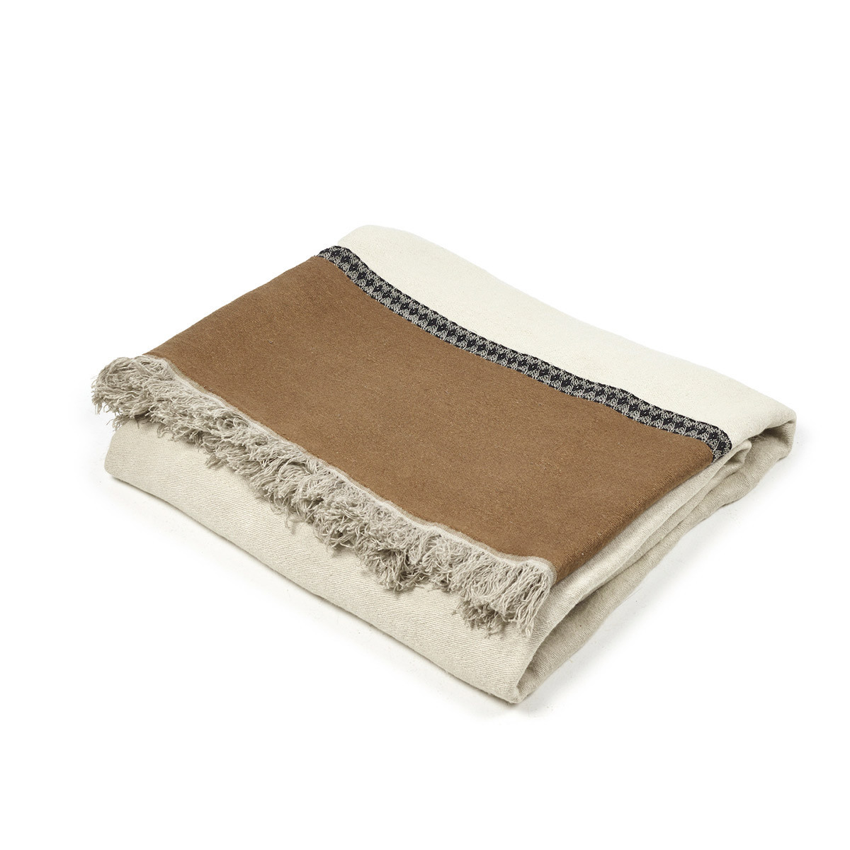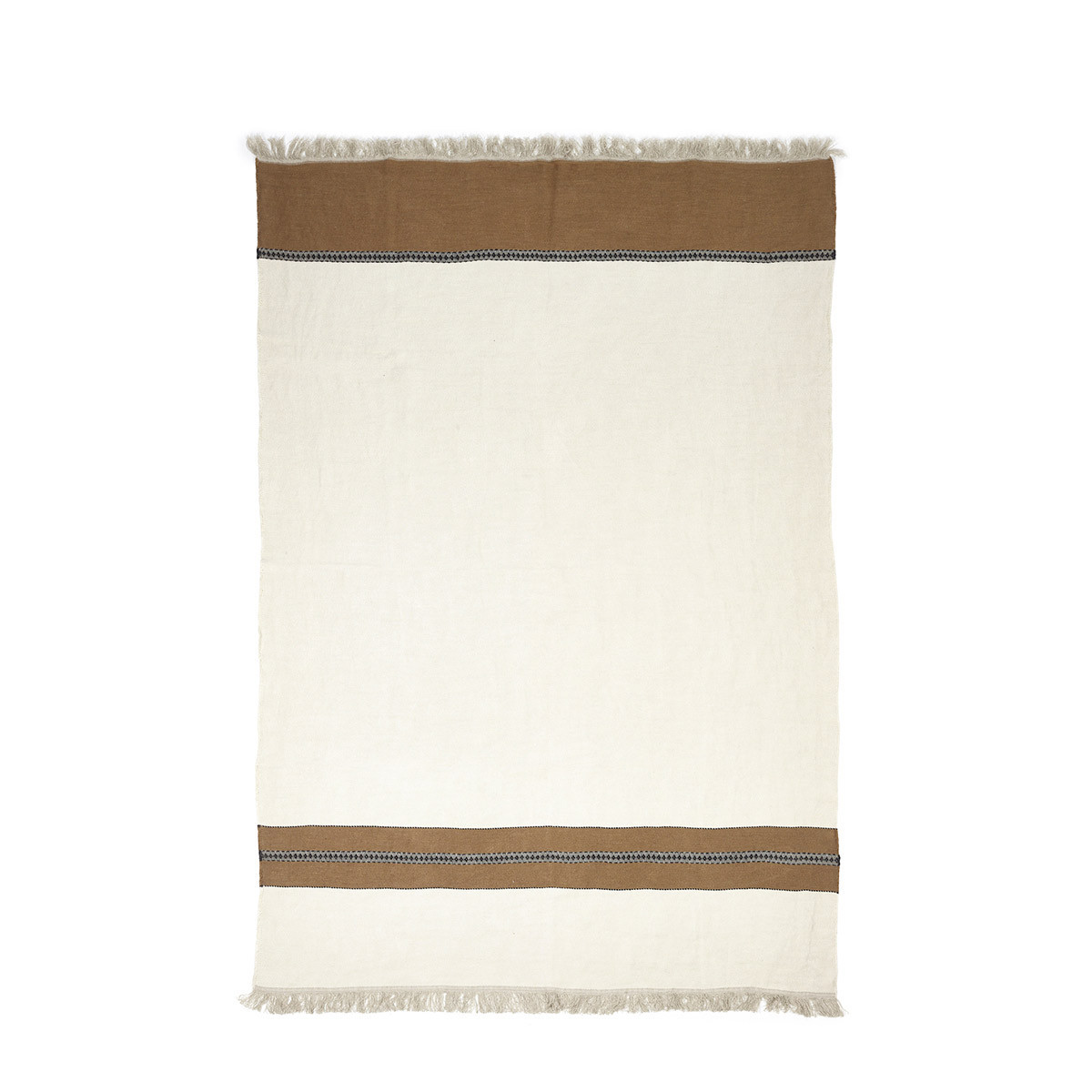 Plaid Etienne de Libeco. Lin 100% (585 g/m²). Rayures gingembre, noir et bone sur fond naturel. Poids moyen, fini par franges. Dimension 140x220 cm.