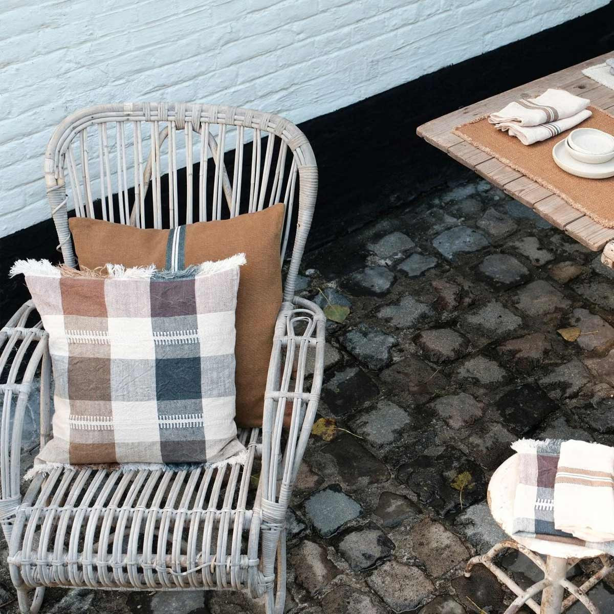 Housse de coussin Maxine de Libeco. Lin 100% (380 g/m²). Motif à carreaux Check mêlant chêne brun, rouille, bleu-gris et blanc cassé. Finition lavée, franges sur deux côtés. Dimension 50x50 cm.