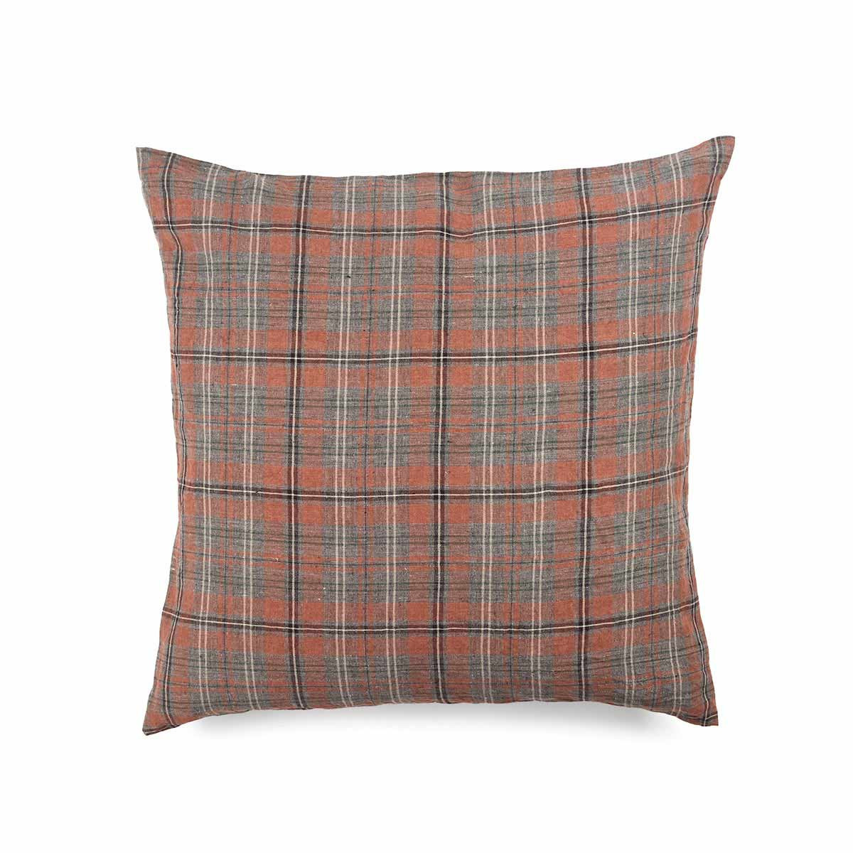 Taie d'oreiller Jude Libeco. Lin 100% pur lavé (200 g/m²). Motif à carreaux brun Sienne et gris anthracite avec tissage sergé. Douce, chaleureuse et certifiée Masters of Linen pour les nuits d'hiver.