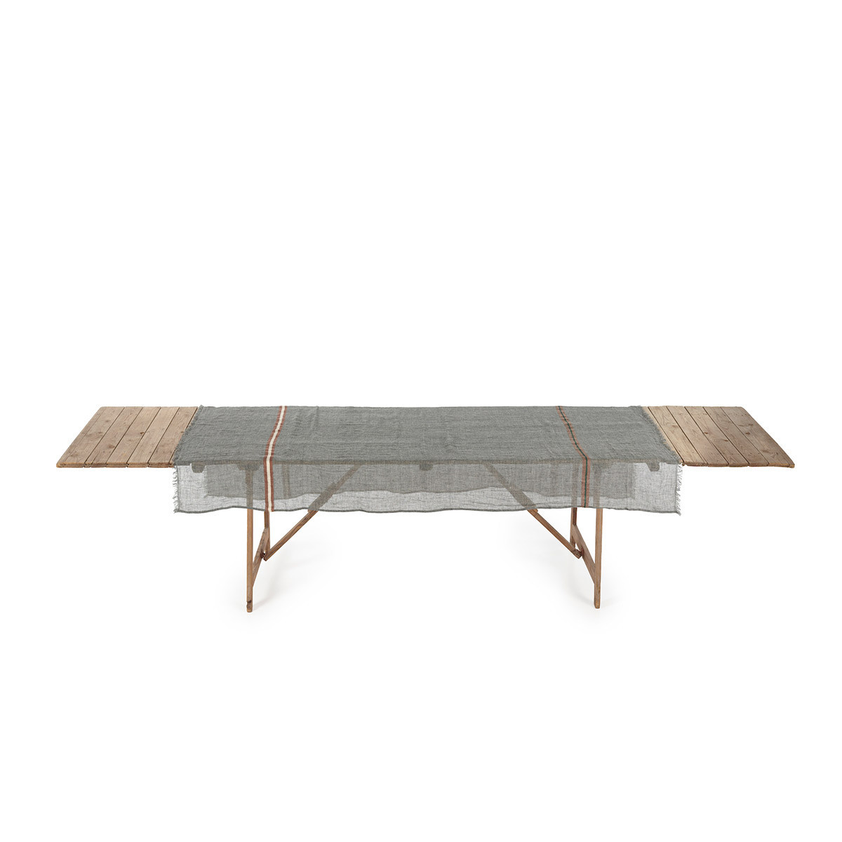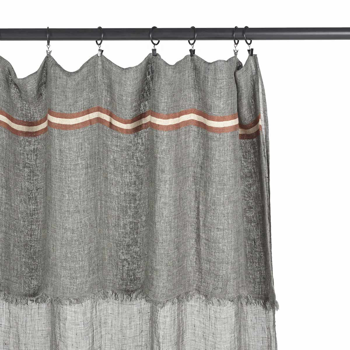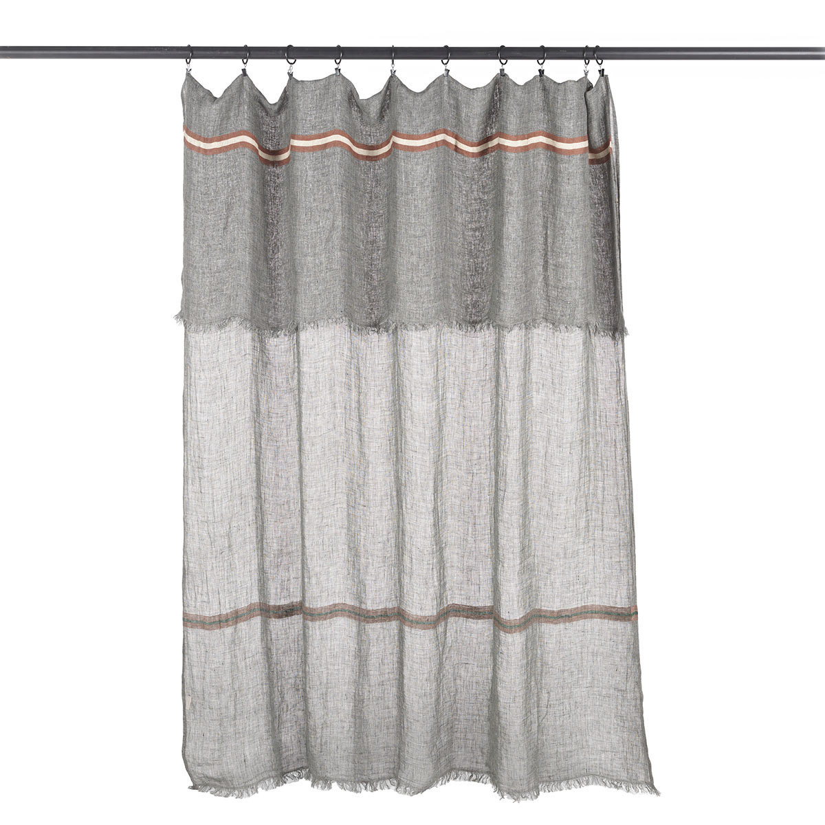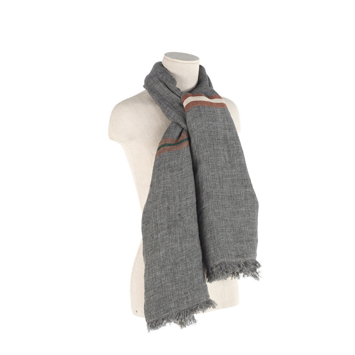 Pièce de lin Arlo Libeco. Lin 100% pur lavé (90 g/m²). Motif à rayures vert, noir, brun et ivoire sur fond gris. Idéale pour la confection ou comme jeté de décoration. Certifiée Masters of Linen.