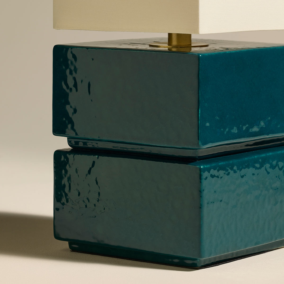 Le socle révèle deux blocs rectangulaires aux angles arrondis, empilés avec précision. L'émail réactif bleu pétrole couvre les surfaces de micro-craquelures et de variations subtiles qui donnent à la faïence une texture vivante, loin de toute uniformité industrielle. Le raccord laiton doré, petit disque brillant posé au sommet du premier bloc, apporte une touche précieuse à la jonction entre la céramique et le coton de l'abat-jour. Ce dernier, rectangulaire et élancé, diffuse une lumière douce par ses quatre faces et laisse le plafond recevoir l'essentiel du halo lumineux par son ouverture supérieure.