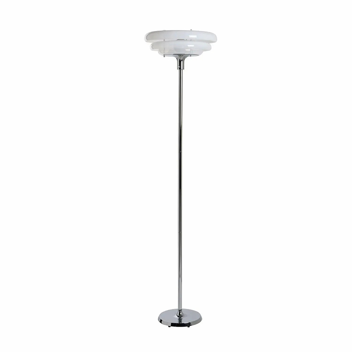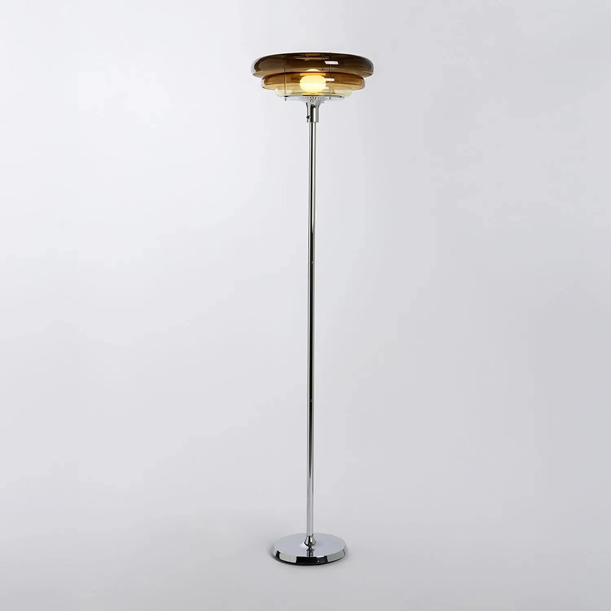La particularité du lampadaire réside dans son empilement d’abat-jour en verre peint, aux formes arrondies rappelant des donuts, qui créent un subtil dégradé lumineux. Ce jeu de volumes apporte profondeur et originalité, transformant le lampadaire en véritable pièce décorative.