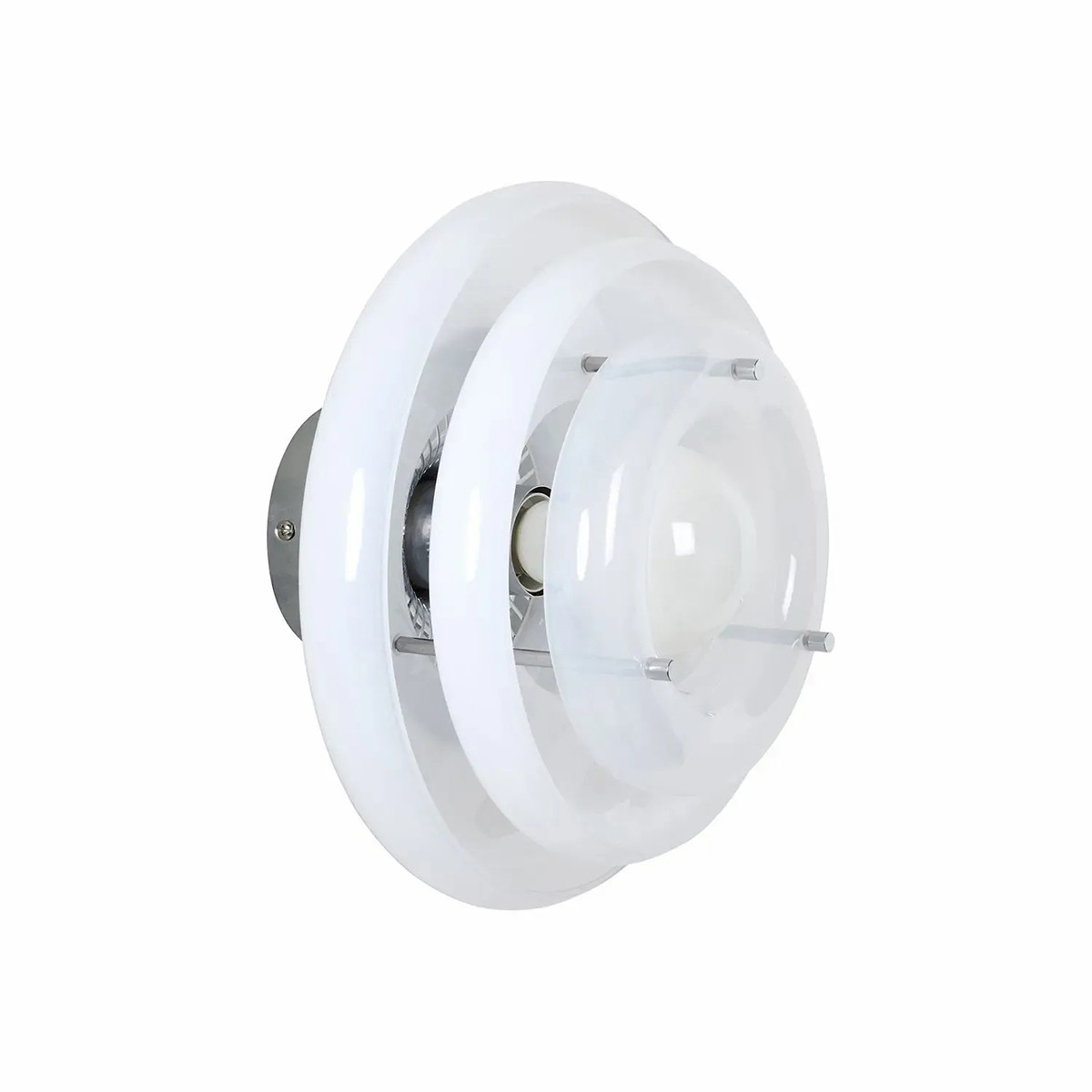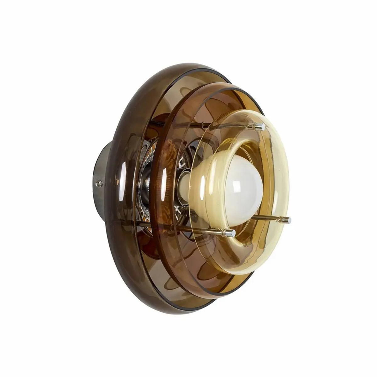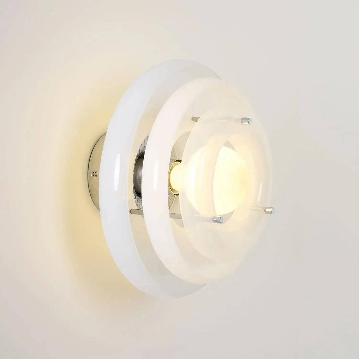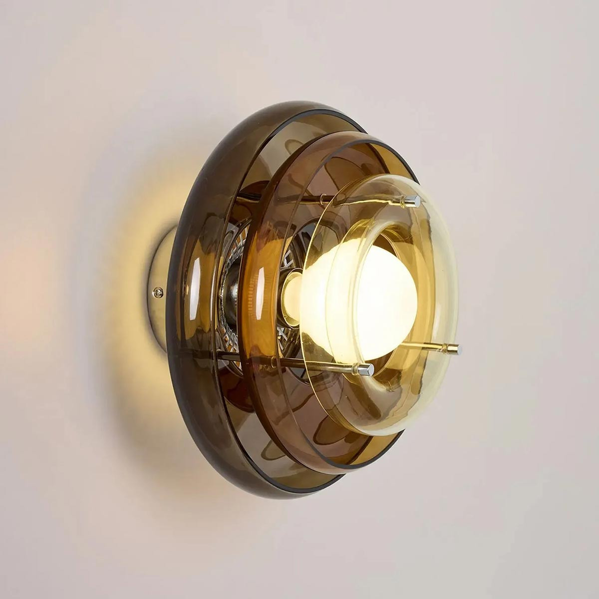 Son caractère unique provient de l’empilement d’abat-jour en verre peint, en forme de donuts, qui génère un dégradé lumineux subtil. Ce jeu de volumes apporte profondeur et style, transformant l’applique en véritable objet décoratif mural.