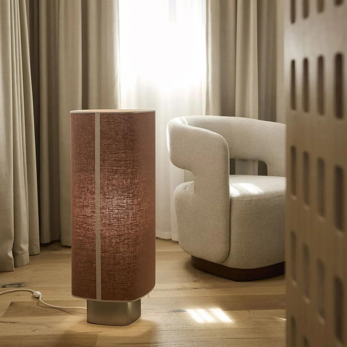 Lampe à poser DOLCE Market Set. Style moderniste, idéale pour une ambiance feutrée, abat-jour en lin et coton. H79 cm, design français.