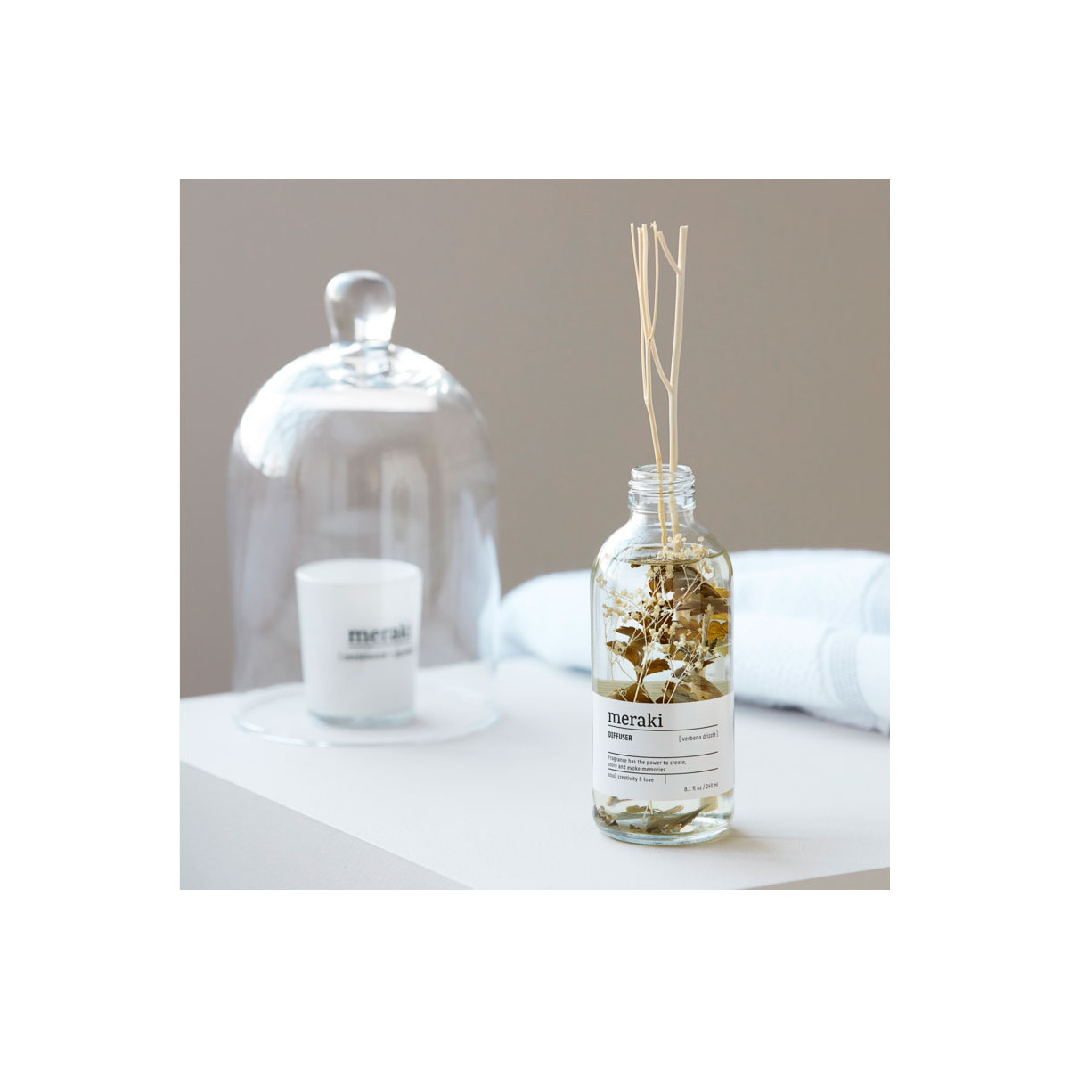 Diffuseur Parfum d'Ambiance Méraki - Verbena Drizzle 240ml. Diffuse un parfum apaisant de verveine et de citronnelle, idéal pour une ambiance relaxante. Méraki.