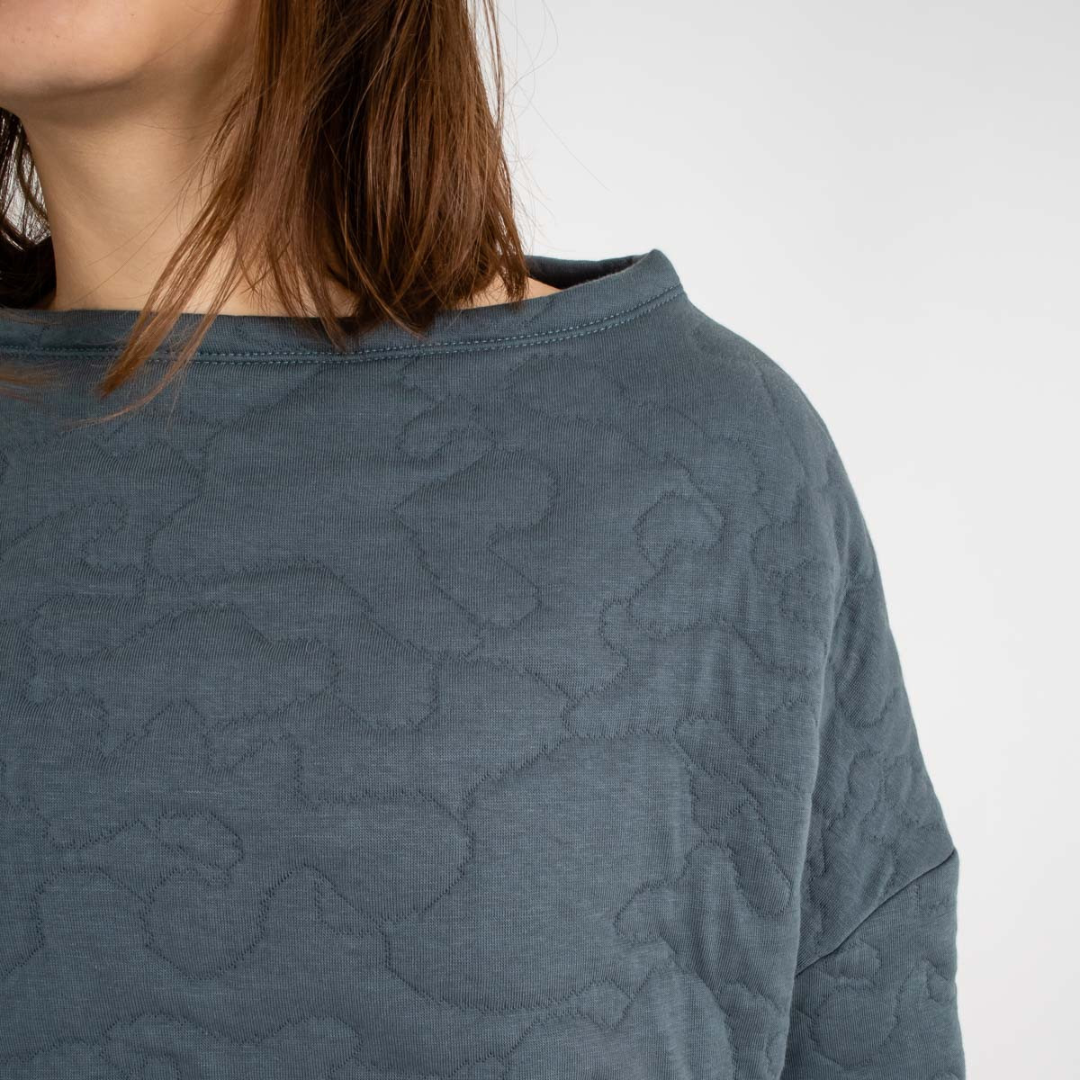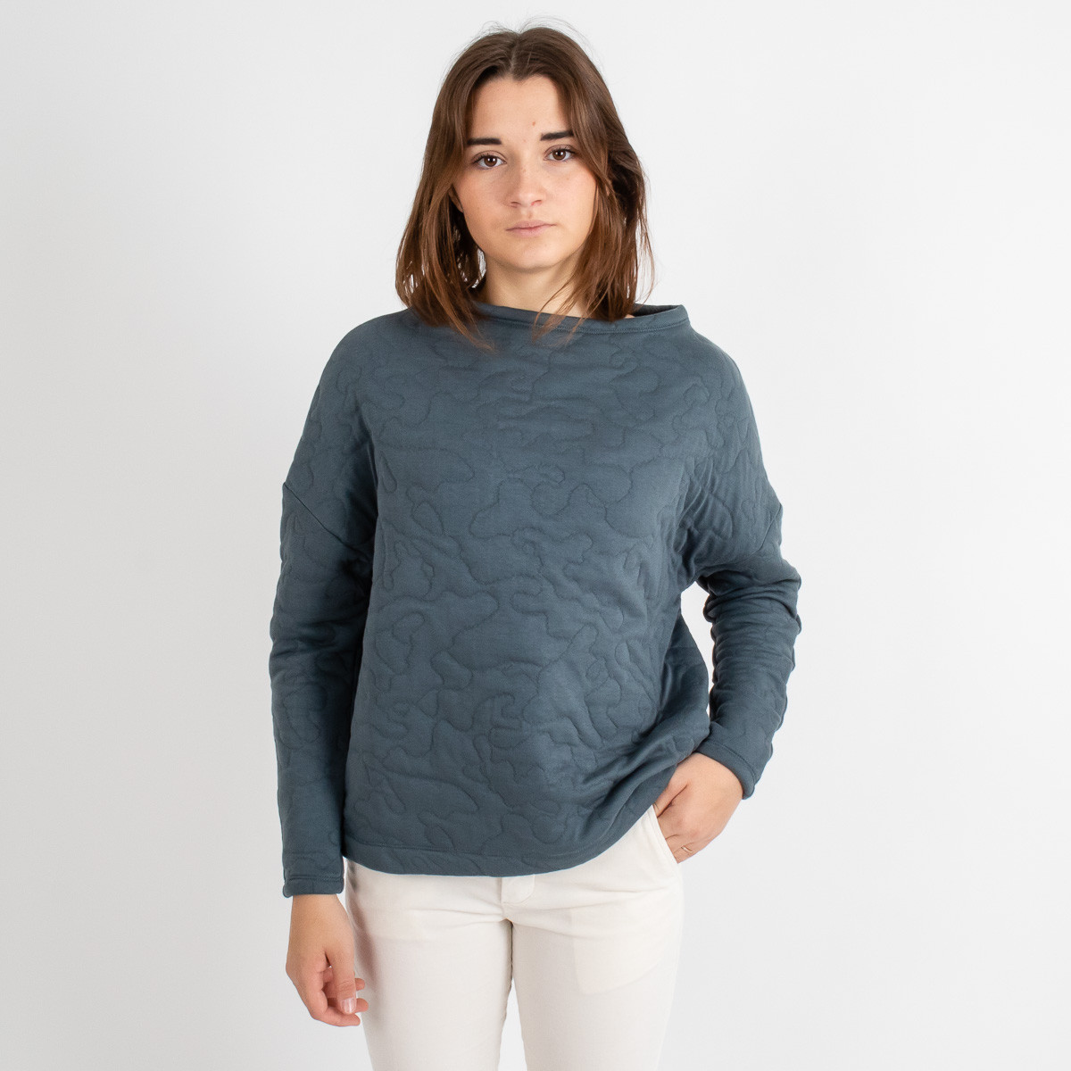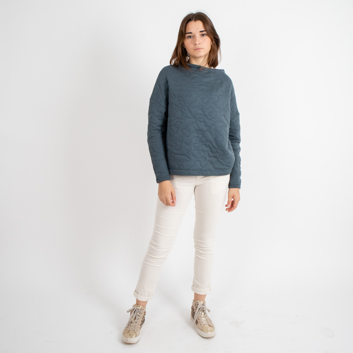 Pull loose en coton matelassé. Epaules tombantes, encolure bateau, un peu montante. Manches larges. Le coloris Vase est un Vert kaki