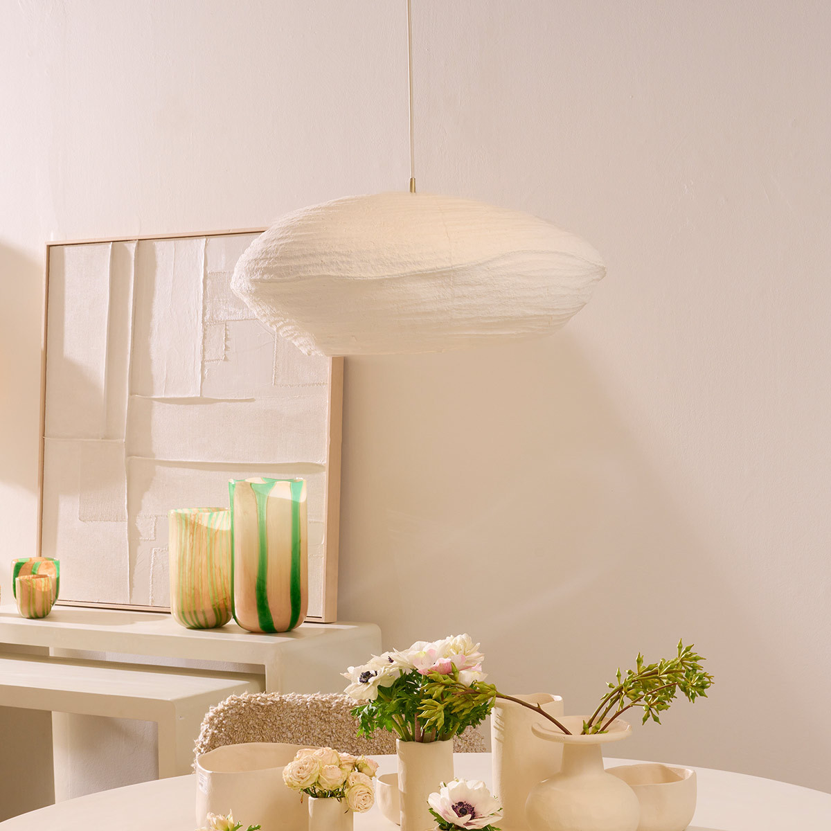 Le papier mâché, matériau naturel et léger, confère à cette suspension une texture douce et une allure organique. La forme ovale, douce et enveloppante, apportera une touche de modernité à votre espace. Disponible en deux tailles, elle s'adaptera à tous vos besoins et à tous les volumes de pièce.