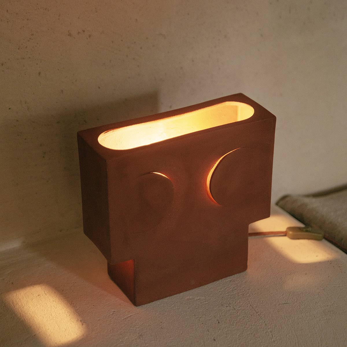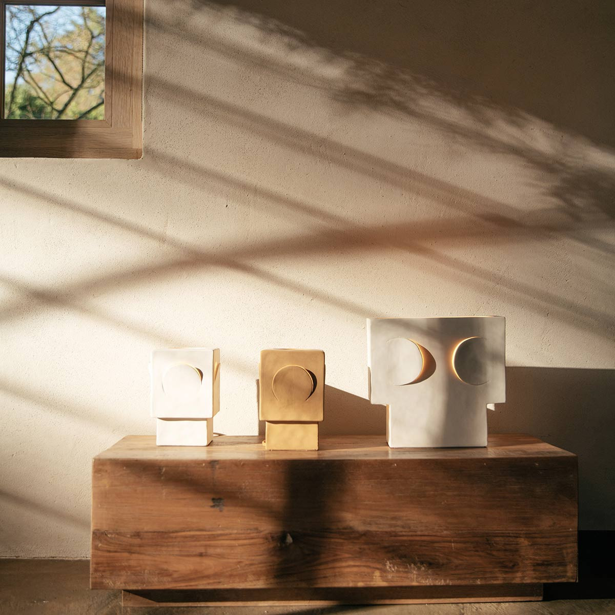 Lampe à poser Eclipse de Pomax en grès. Design cubiste inspiré des astres. Disponible en 2 tailles et 3 coloris (Blanc, Terracotta, Ocre). Une œuvre lumineuse.