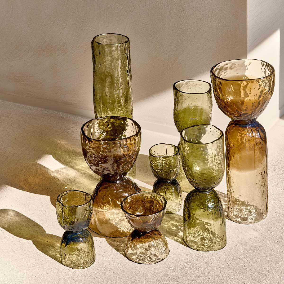 Comme on peut le voir sur les visuels, ces pièces en verre de haute qualité se déclinent en deux teintes minérales : un Vert foncé profond et un Fumé (brun foncé) sophistiqué. Grâce aux six dimensions disponibles, vous pouvez jouer sur les hauteurs et les volumes en les disposant seuls ou en accumulation pour un effet visuel saisissant.
