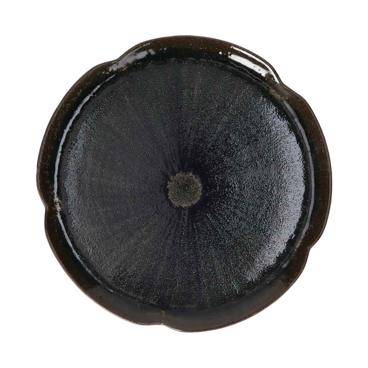 L'assiette de présentation (Ø 31 × H 2,1 cm), la plus grande de la série, adopte un bord festonné modelé à la main et une glaçure sombre brillante mouchetée sur l'ensemble de la surface — la pièce la plus affirmée du set, pensée pour occuper le centre de la table.