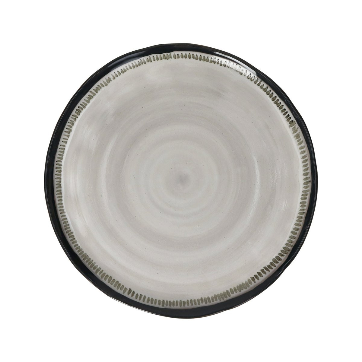 La première assiette plate (Ø 27) développe une spirale concentrique blanc-gris peinte sur fond de glaçure blanche, encadrée par un large bord noir brillant. Entre le bord et le centre, une couronne de petits traits verticaux peints à la main crée une transition décorative dense et graphique — le décor le plus élaboré de la série.