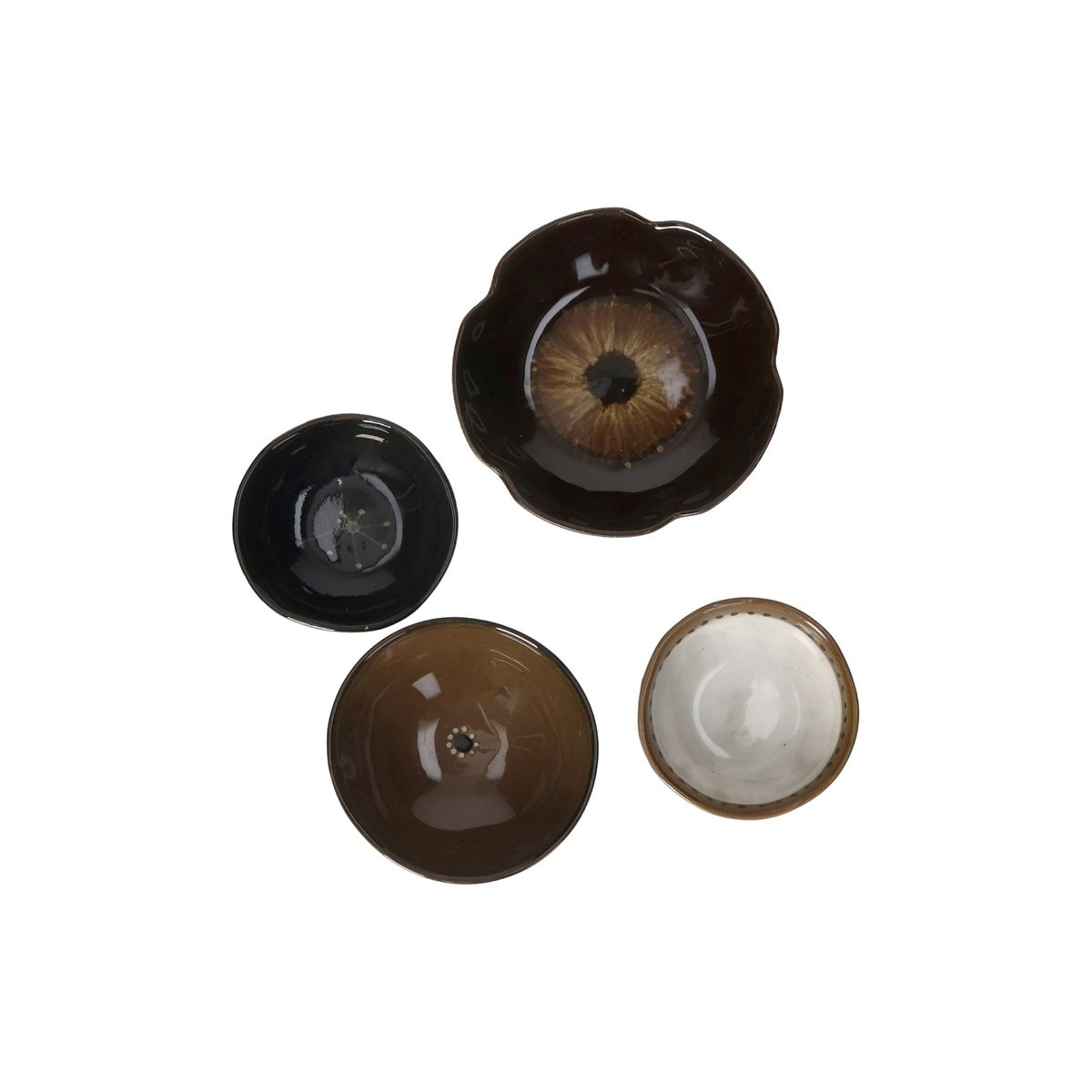 Fabriqués en grès vitré, les quatre bols du set présentent des formats compacts adaptés aux petites portions — tapas, mises en bouche, condiments, sauces, olives ou sel. Le plus grand (Ø 12,5 × H 2,5 cm) adopte un bord festonné modelé à la main et un décor radiant profond ; les trois autres (Ø 10 × H 3,5 cm et deux Ø 8,5 × H 3 cm) présentent des formats plus ramassés à bord lisse. Chacun des quatre bols a son intérieur peint à la main avant émaillage : le décor est intégré sous la glaçure lors de la cuisson, ce qui le rend aussi stable au lave-vaisselle que la glaçure elle-même — il ne s'efface pas, ne s'écaille pas, ne pâlit pas avec les lavages répétés.