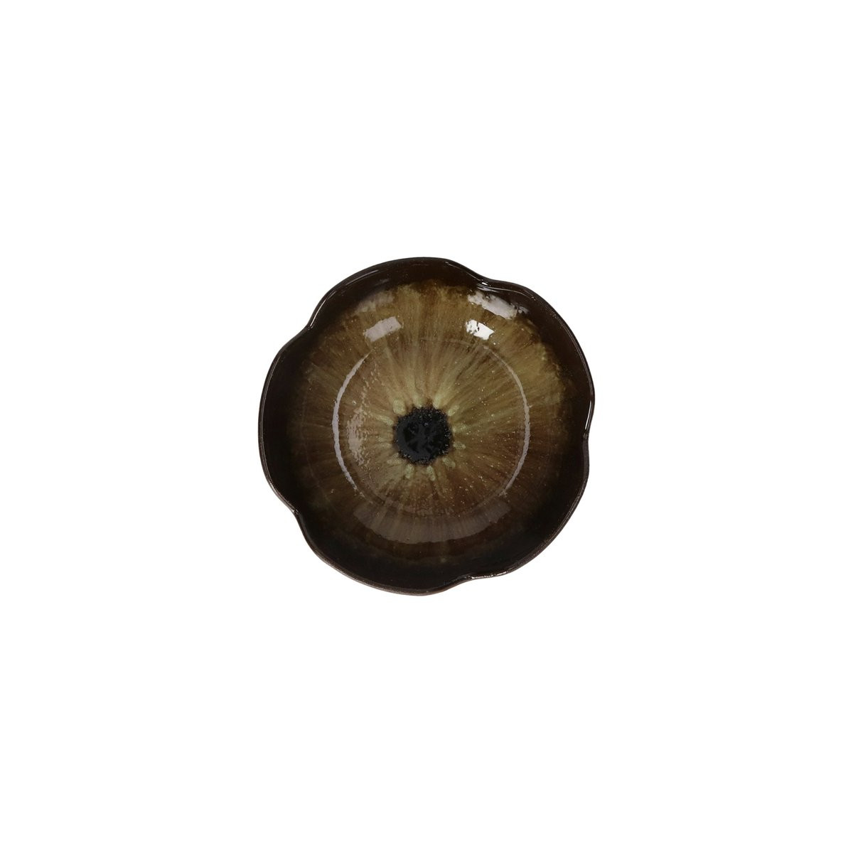 Intérieur — Un fond de glaçure brun-noir profond et brillant couvre l'ensemble de l'intérieur. Depuis un centre noir intense et légèrement texturé, des rayons fins s'élancent dans des tonalités brun-olive et kaki — plus clairs au cœur, progressivement plus sombres vers le bord. Les variations de teinte entre les rayons sont prononcées : certains tirent vers le kaki vert, d'autres vers l'ocre chaud, créant une palette intérieure complexe que chaque pièce décline différemment. La glaçure brillante donne à ces tonalités une profondeur et une richesse que le mat ne pourrait pas restituer.