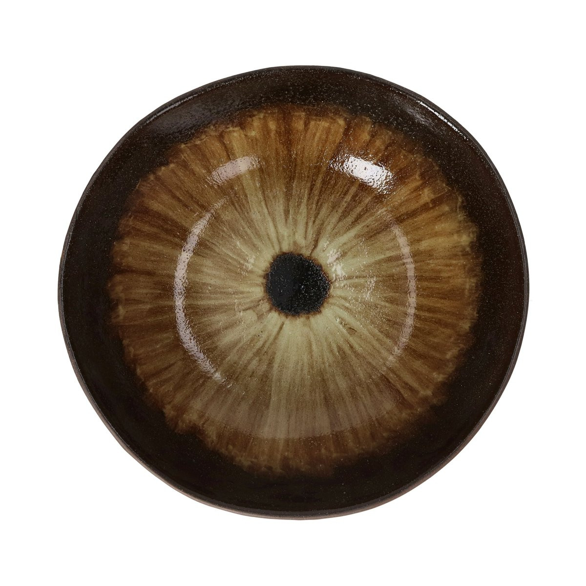 Intérieur — Un fond de glaçure brun sombre, presque noir sur le bord, qui s'éclaircit progressivement vers le centre en nuances brun-ocre, caramel et dorées. Sur ce fond, les rayons peints à la main créent un dégradé concentrique — plus clairs au centre, plus dorés dans la partie médiane, se fondant dans le brun sombre du bord. Le point central est un disque noir mat, dense, qui ancre visuellement l'ensemble du motif.