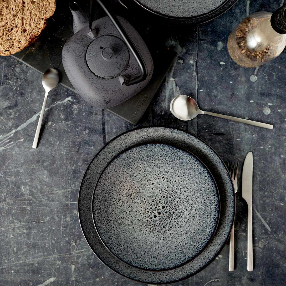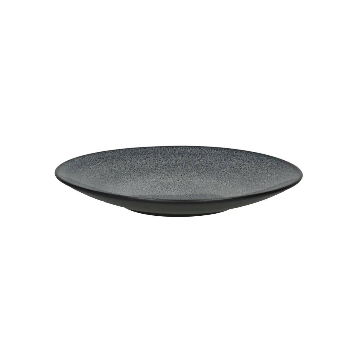 Teinte — Une teinte sombre anthracite, dense et sourde, dont la surface n'est pas uniforme : des micro-inclusions claires — blanc cassé, gris moyen — sont parsemées de manière aléatoire sur l'ensemble de la surface, créant un effet de texture minérale qui varie légèrement d'une pièce à l'autre. La tranche de l'assiette, visible sur l'épaisseur, révèle un grès de teinte identique dans la masse — confirmant que la couleur n'est pas un revêtement mais une composante de la matière elle-même.