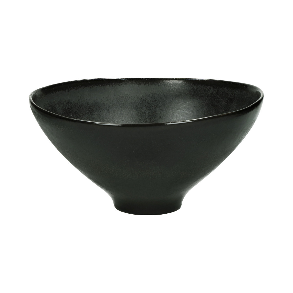 Le saladier Chrom frappe par la pureté de sa forme : un cône très ouvert, aux parois régulières et légèrement incurvées, qui s'élargit généreusement depuis le pied annulaire jusqu'au bord. Ce bord, fin et net, trace un cercle presque parfait qui souligne l'élégance du profil. L'intérieur vitré révèle une glaçure noire irisée, parsemée de micro-reflets ardoisés qui donnent de la profondeur à la surface et rappellent les céramiques cuites au four à bois. L'extérieur, plus mat et plus dense, contraste discrètement avec ce travail intérieur et donne à la pièce son caractère à la fois sobre et précieux.