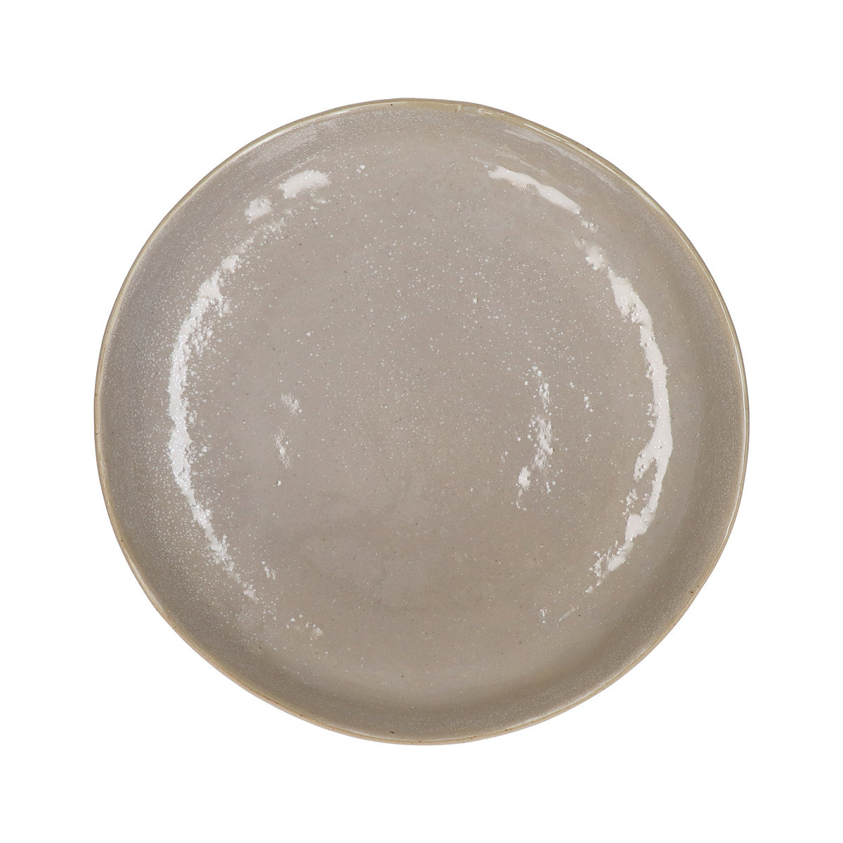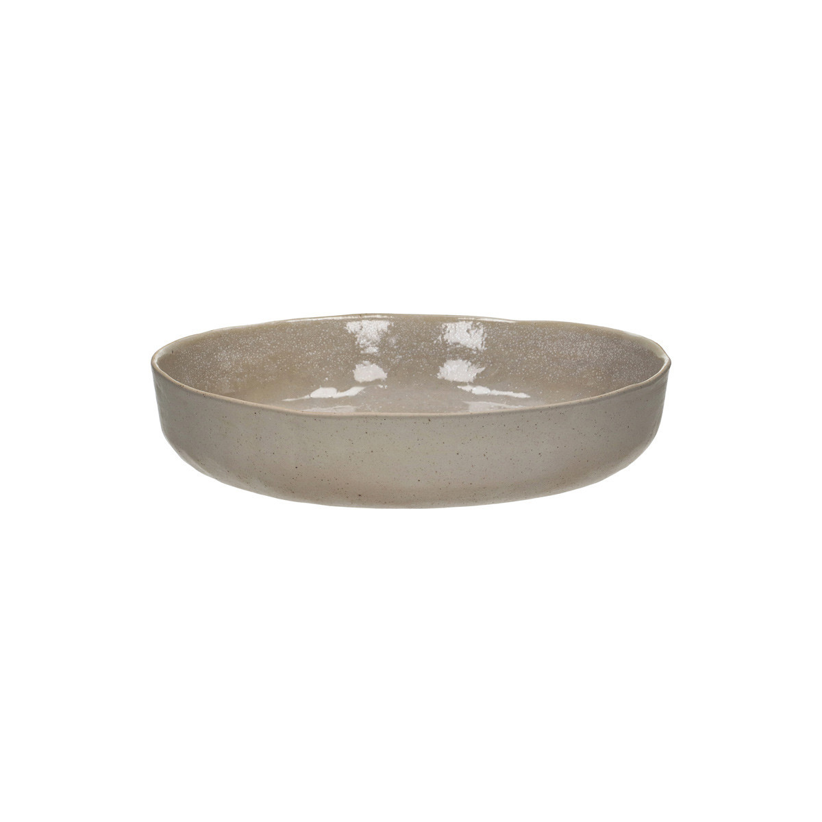— Teinte : beige sablé chaud aux nuances taupe et ivoire, homogène sur l'intérieur émaillé. L'extérieur en grès non émaillé affiche une teinte gris stone naturelle mouchetée de points sombres — teinte distincte de l'intérieur, ce qui crée une dualité visuelle entre les deux faces.