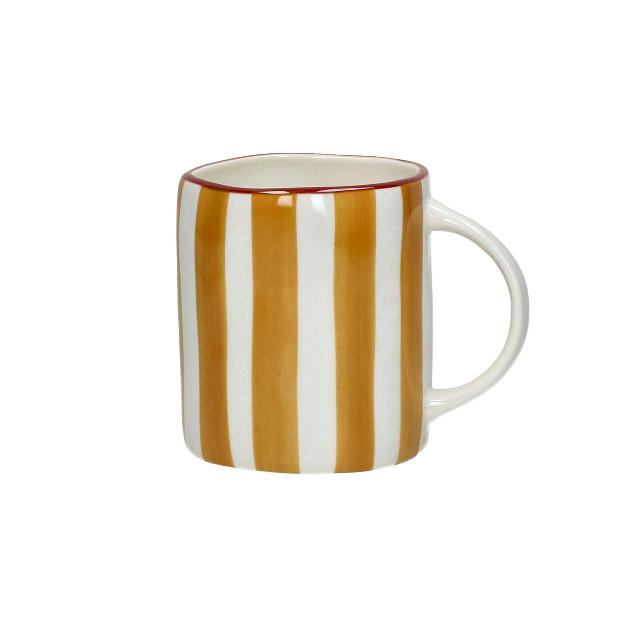 — Fond / Base : blanc ivoire vitré, en alternance régulière avec les rayures jaune ocre sur tout l'extérieur. Même organisation que le coloris Vert — intérieur entièrement blanc, anse blanche non décorée.