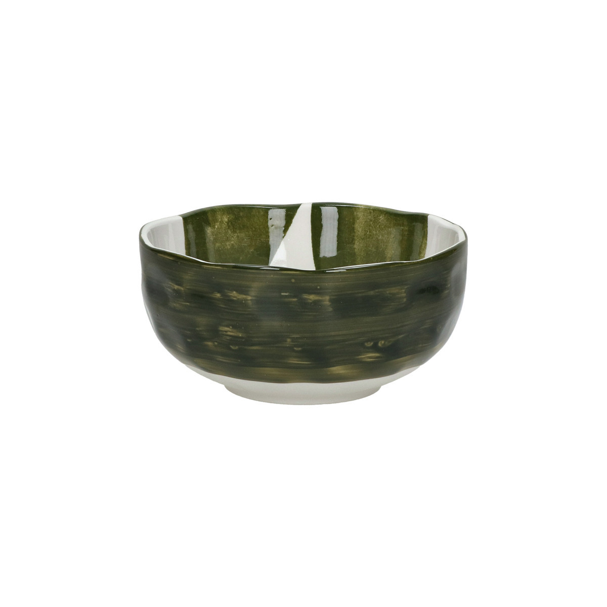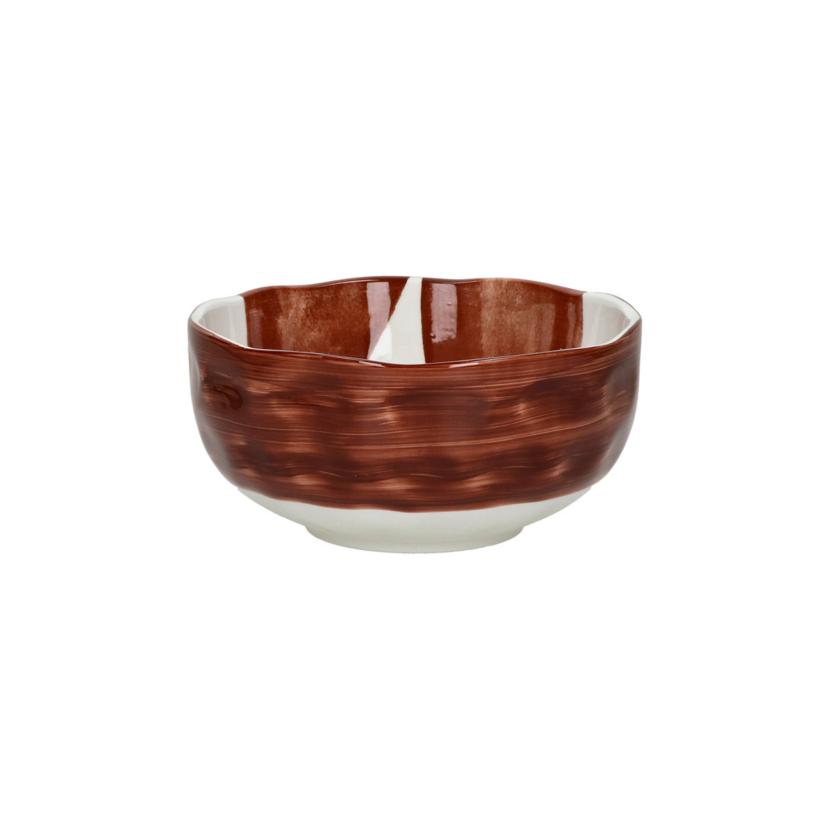 Fabriqué en porcelaine émaillée vitrée, ce bol affiche un diamètre de 15,2 cm pour une hauteur de 6 cm — un format polyvalent, aussi à l'aise pour une soupe que pour un dessert, un petit-déjeuner ou une mise en bouche. Comme l'ensemble de la collection LABO, le décor est appliqué à la main : sur le coloris Vert, de larges coups de pinceau horizontaux recouvrent l'extérieur du bol, tandis que l'intérieur révèle des taches rondes libres sur fond blanc. Sur le coloris Rouille, le rouge brique brossé en aplat horizontal couvre tout l'extérieur avec une intensité chaude et dense, quand l'intérieur laisse apparaître deux ou trois taches arrondies sur fond ivoire. Dans les deux cas, le bord festonné légèrement ondulé signe l'identité visuelle de la collection.