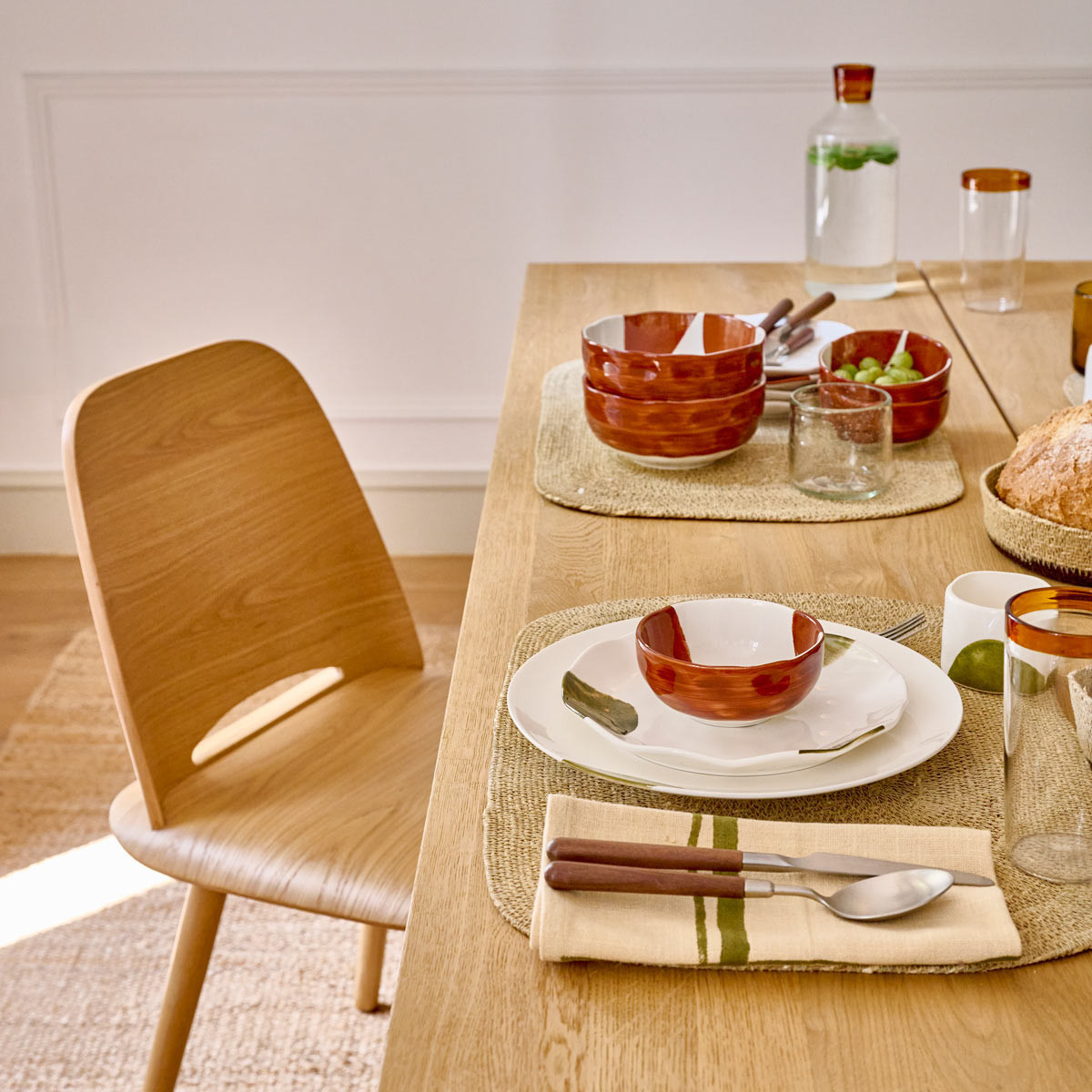 — Ambiance : table chaleureuse et terracotta. À associer avec vaisselle blanche ou crème, plateau en bois clair, serviettes en lin lavé. S'intègre dans un univers automnal, méditerranéen ou wabi-sabi.