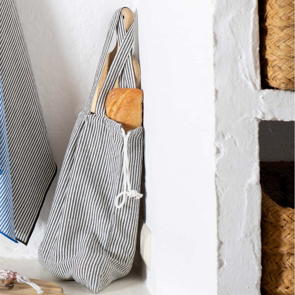 Sac à pain Lou Vent du Sud (30x40 cm) en lin et coton lavé. Design à rayures milleraies chic et naturel pour conserver votre pain avec style et élégance.
