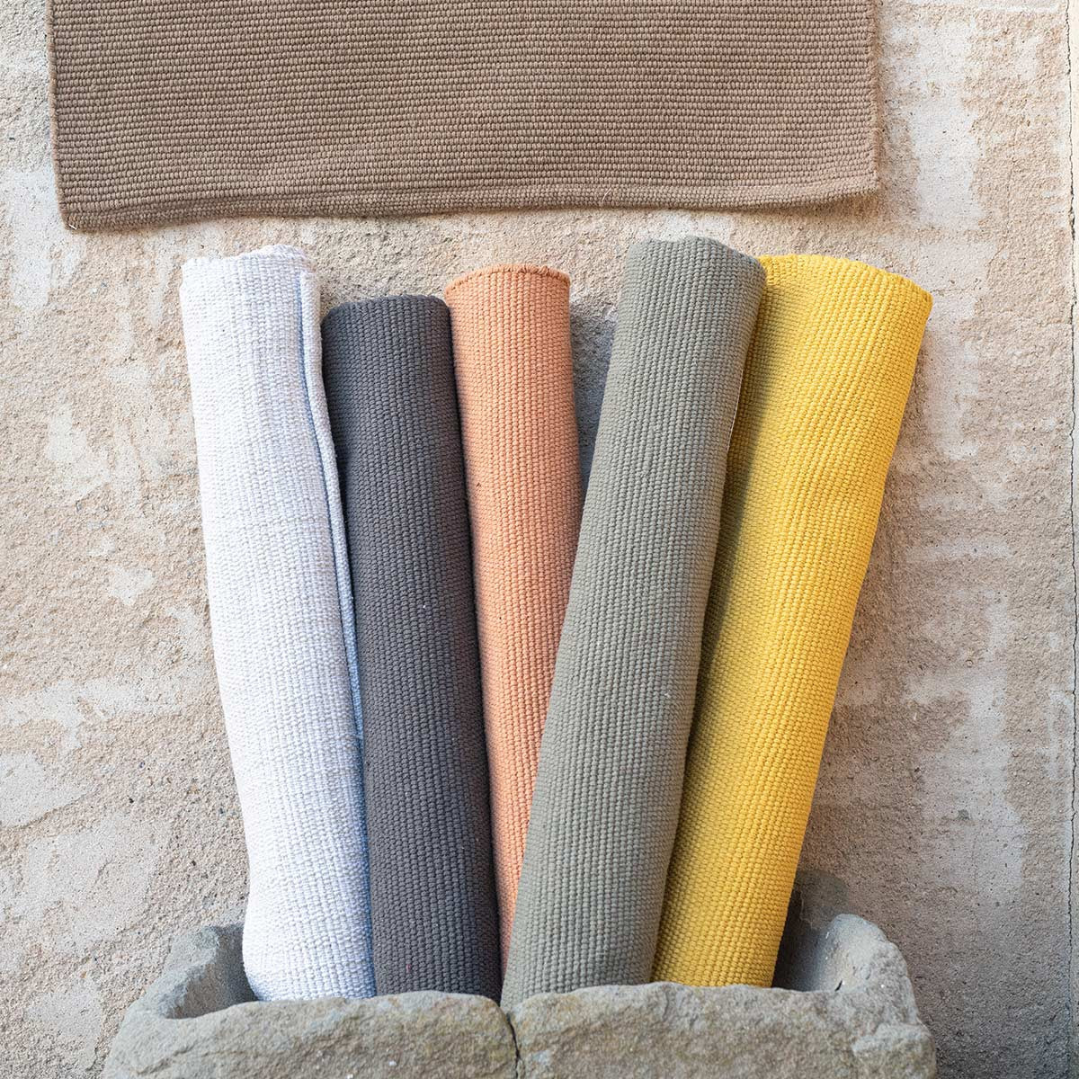 Tapis de sol Moorea Vent du Sud en 100% coton chiné (1200 g/m²). Tissage artisanal épais et robuste pour un confort naturel. 4 tailles et 10 coloris disponibles.