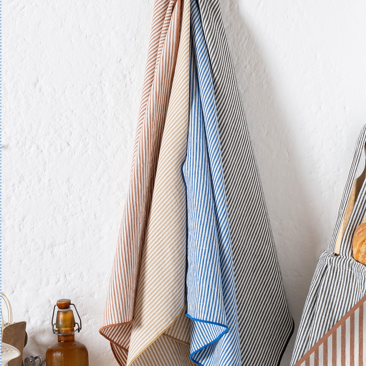 Torchon Lou Vent du Sud (50x70 cm). Mélange lin et coton lavé à rayures milleraies et finition point bourdon. L'élégance et l'absorption pour votre cuisine.