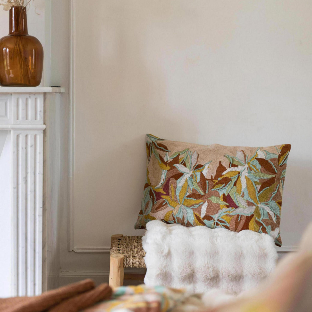 Format 30 x 50 cm — Le format bannière cadre la composition sur la partie inférieure du motif, les feuilles montant depuis le bas du coussin. Sur le coloris Dragée, le fond nude est bien visible en haut du coussin, créant un dégradé naturel vers la broderie dense. Sur le coloris Pétrole, le fond sombre est visible en haut, les feuilles multicolores jaillissant du bas avec énergie.