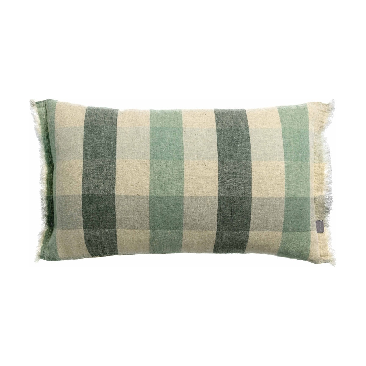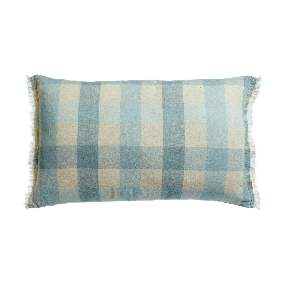 Coussin KATE Vivaraise – Lin recyclé et coton, carreaux vichy larges, finition franges. 4 coloris. Disponible en 30x50 et 40x65 cm.