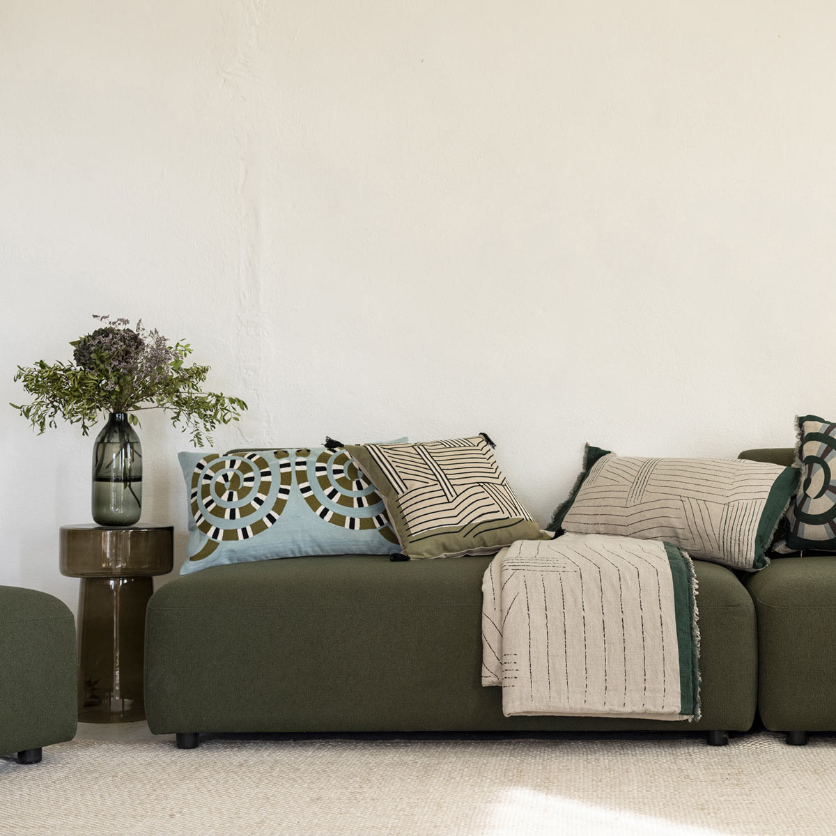 Sa finition franges sur les petits côtés — reprenant le coloris vert sauge profond des bordures — apporte un détail artisanal qui enrichit visuellement ce coussin 40x65 cm sans l'alourdir. La fermeture par zip invisible garantit une silhouette nette, sans couture apparente.