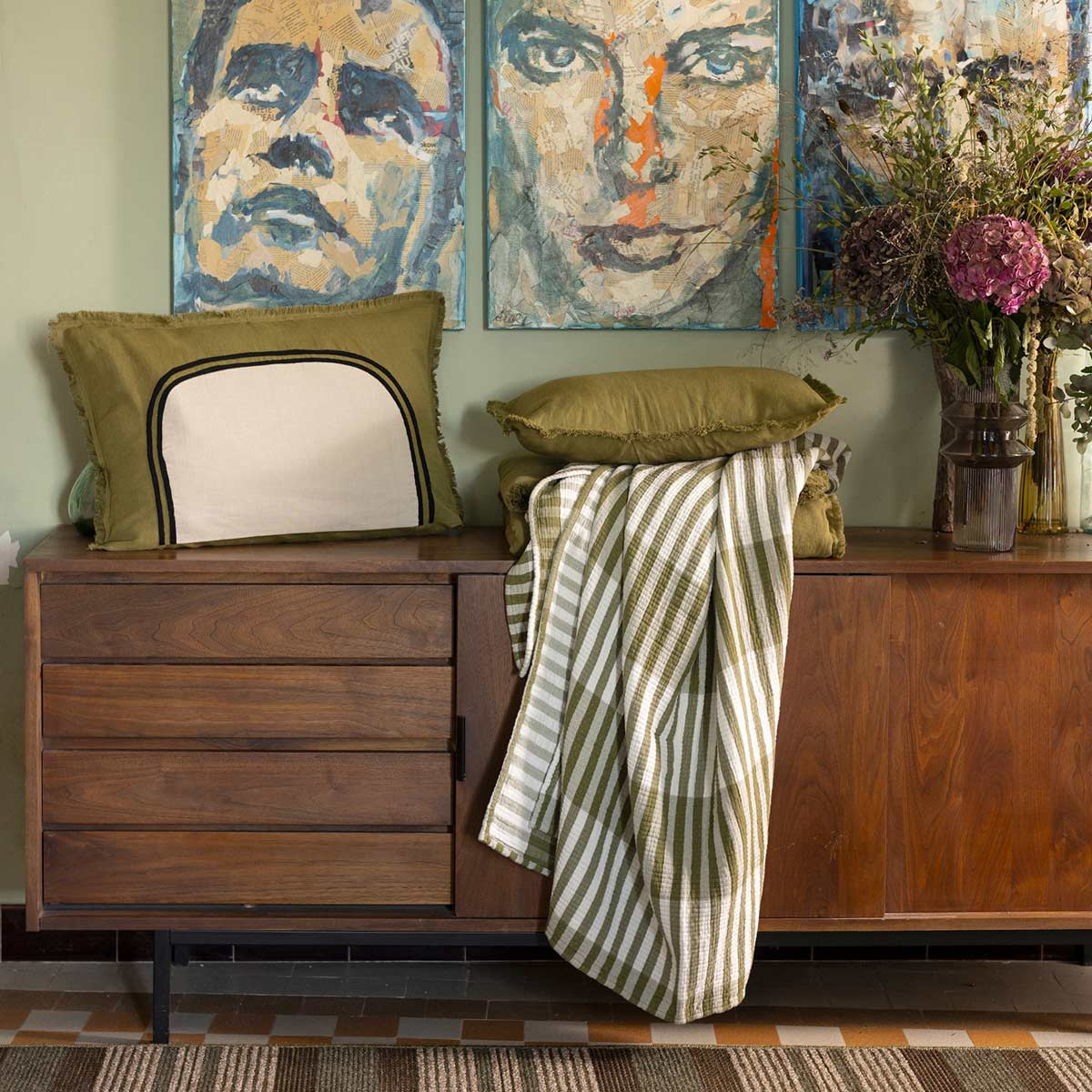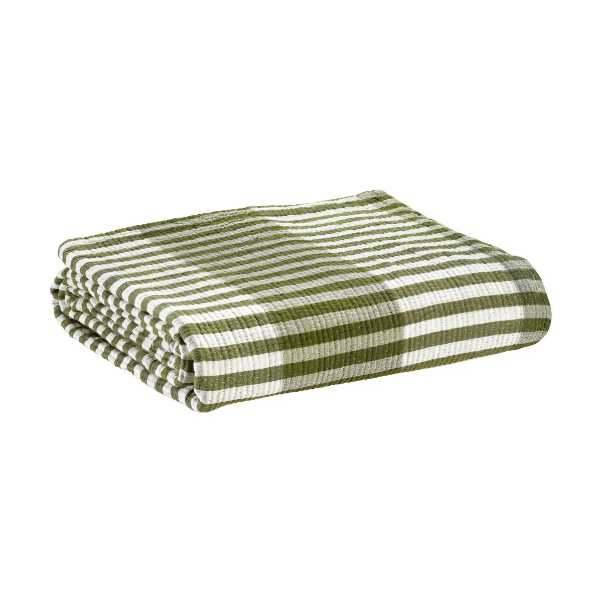 Effet — rayures jacquard en camaïeu de verts, jouant sur la profondeur du tissage pour un rendu organique et chaleureux.